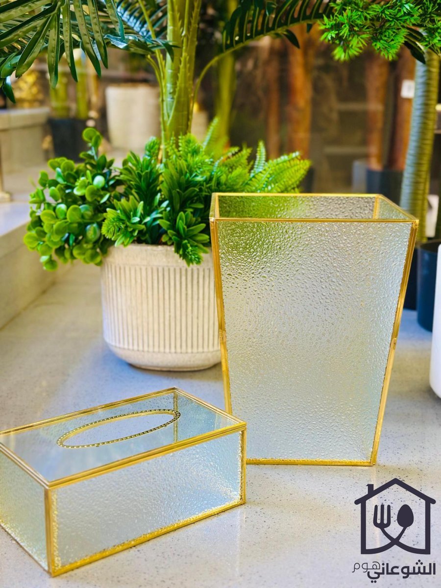 طقم سلة مهملات مع علبة محارم مذهب زجاج شفاف مبزر