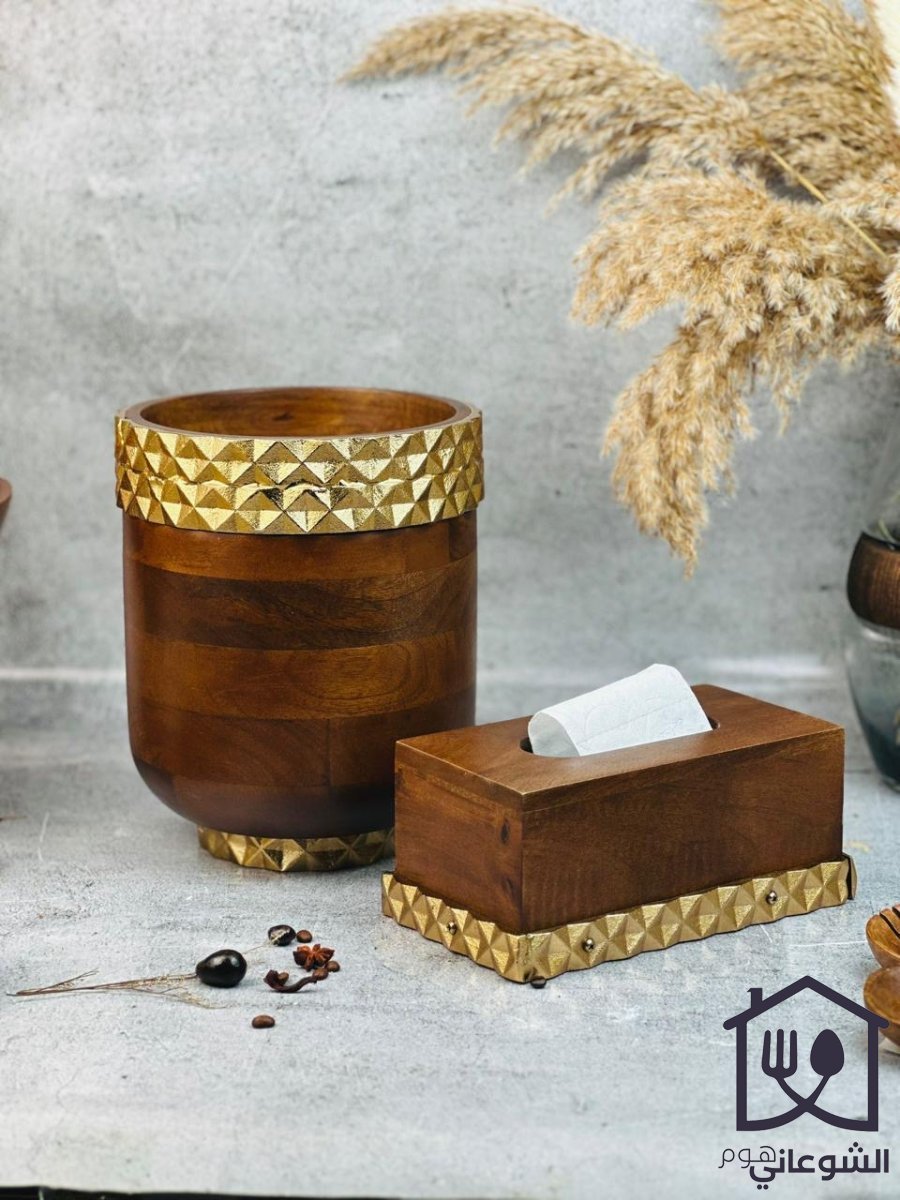طقم سلة مع علبة محارم خشب طبيعي هندي مع قاعدة واطار نحاس هندي