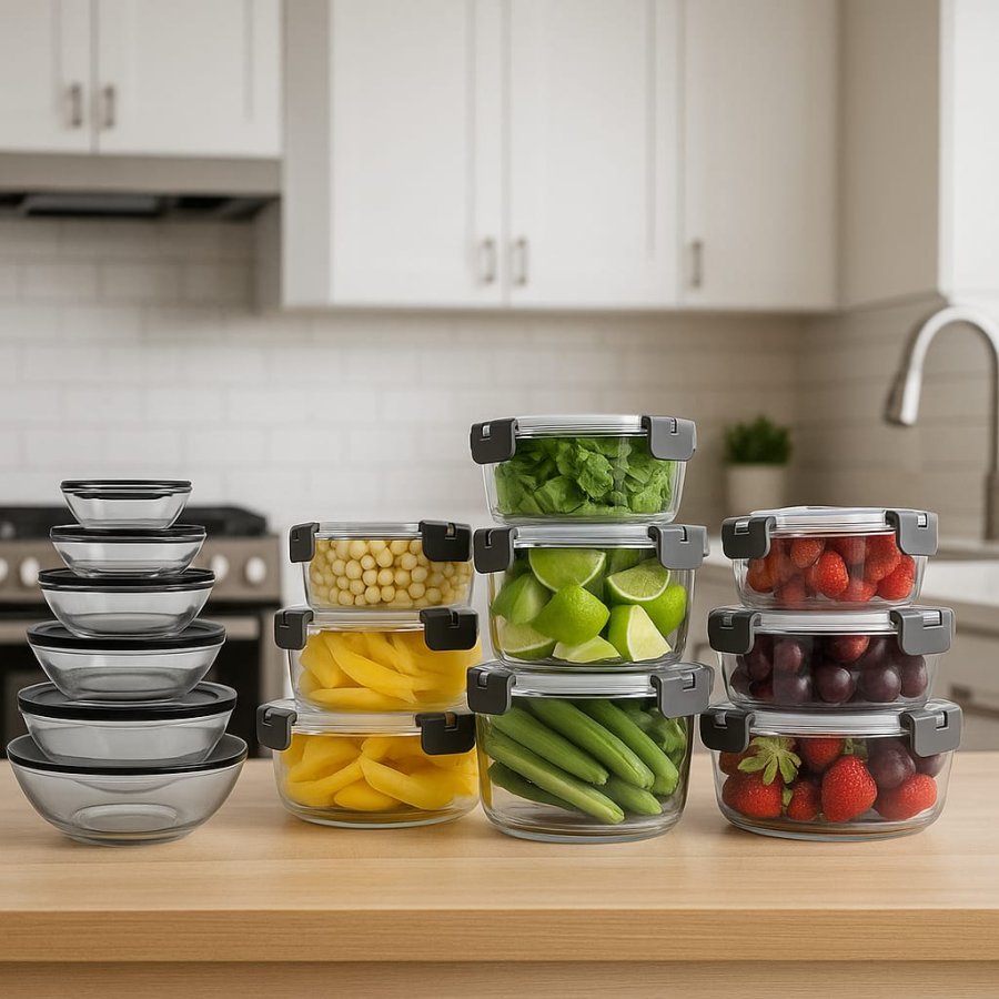 طقم 9 مرتبان زجاج حراري غطاء زجاج محكم الاغلاق ، طقم 5 تبرويرات زجاج غطاء بلاستيك لون اسود