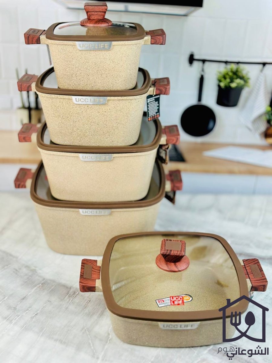✨ طقم طناجر جرانيت فاخر ٥ قطع – قاعدة اندكشن مع غطاء زجاجي بإطار سيليكون ✨