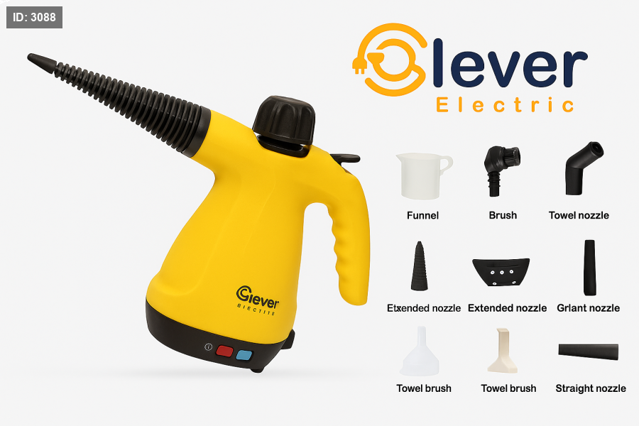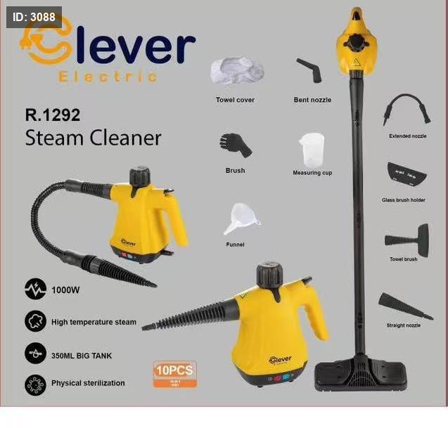 منظف البخار Clever Electric R-1292 بقوة 1000 واط وسعة خزان 350 مل، يعمل بتقنية البخار عالي الحرارة لتنظيف وتعقيم الأسطح المختلفة بفعالية، بدون مواد كيميائية. مثالي لإزالة الأوساخ والجراثيم من الأرضيات، الزجاج، الأثاث، والمفروشات.