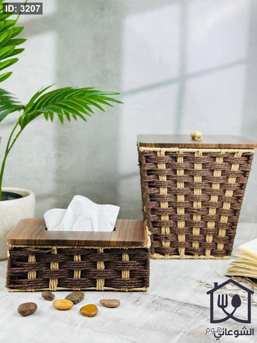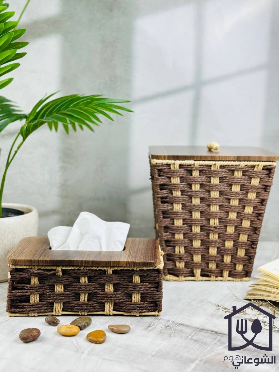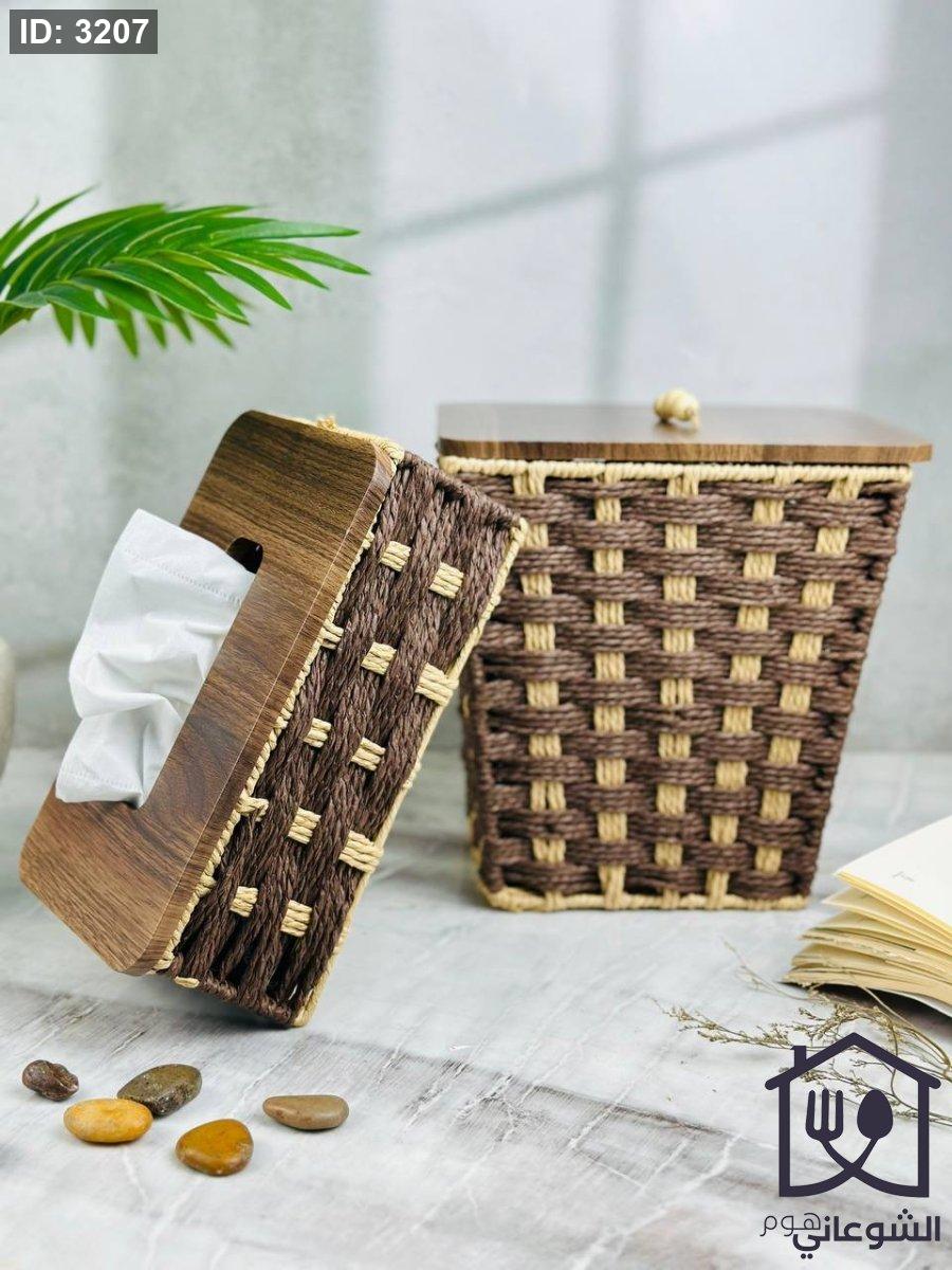طقم سلة مع علبة محارم قش مبطن غطاء خشب مربع