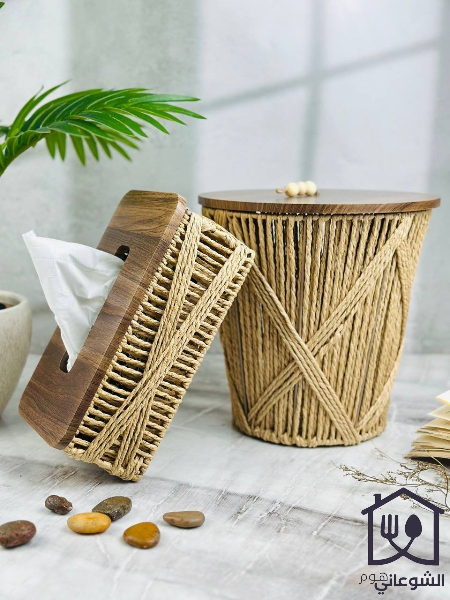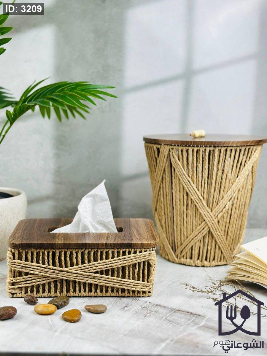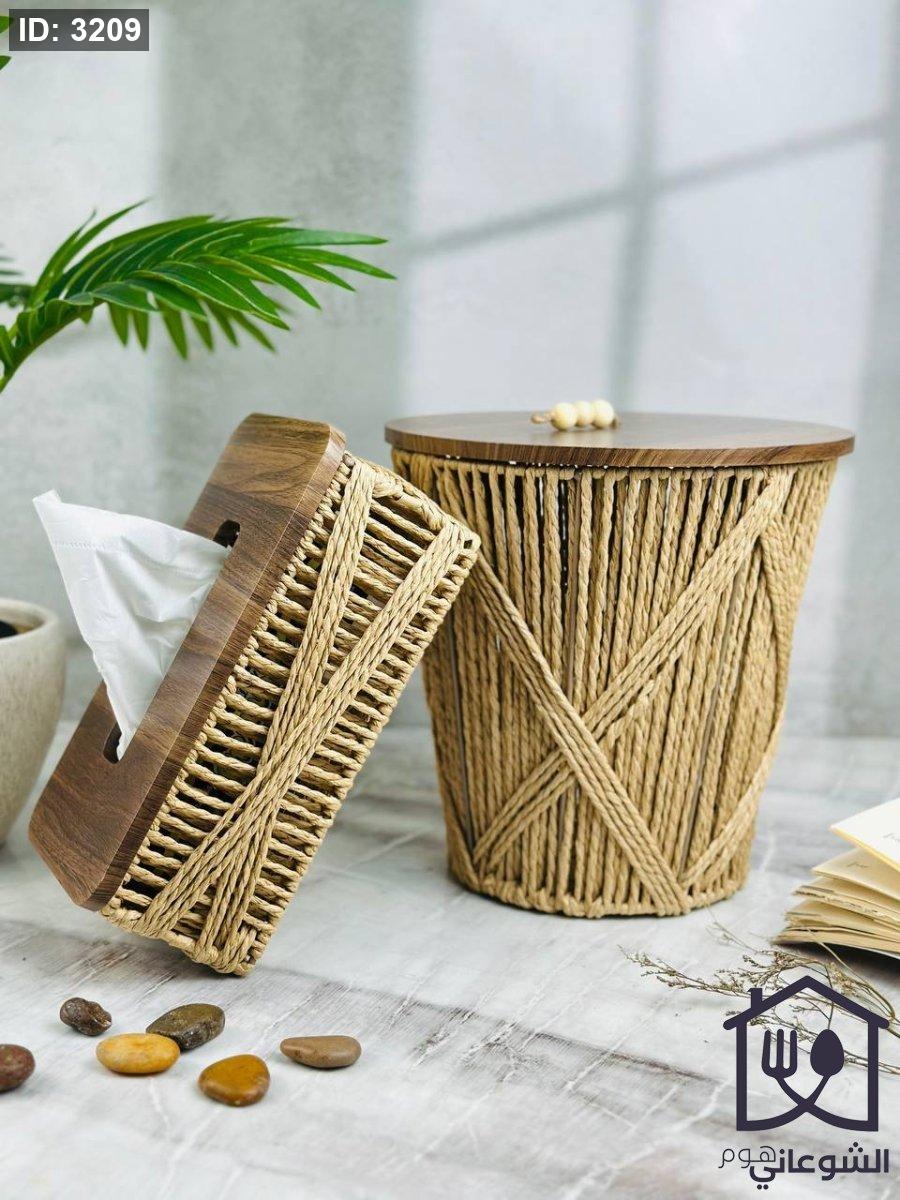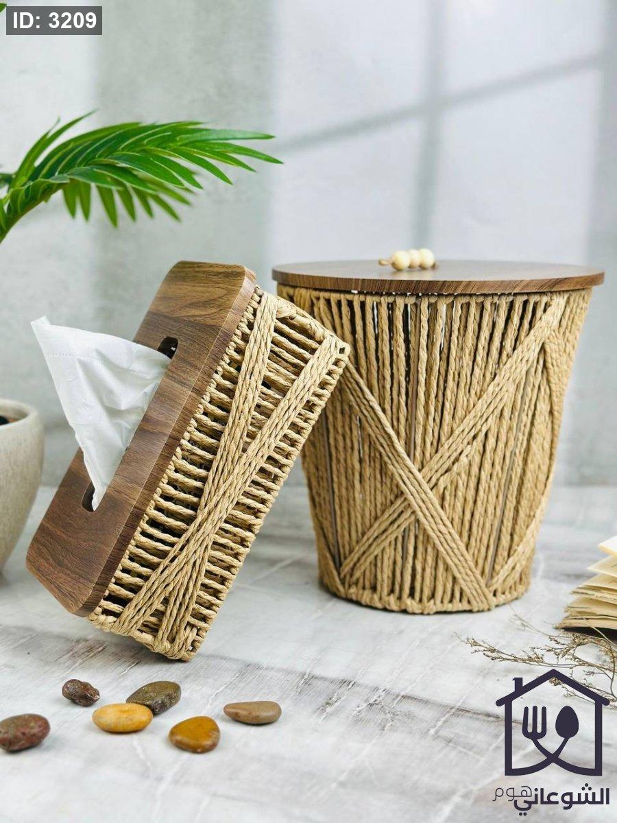 طقم سلة مع علبة محارم قش مبطن غطاء خشب دائري