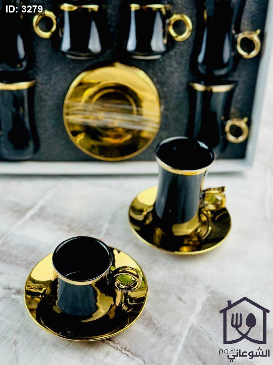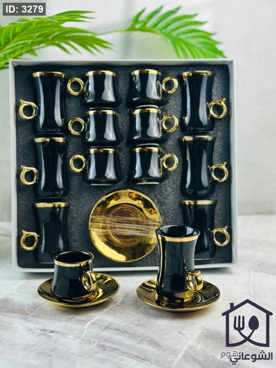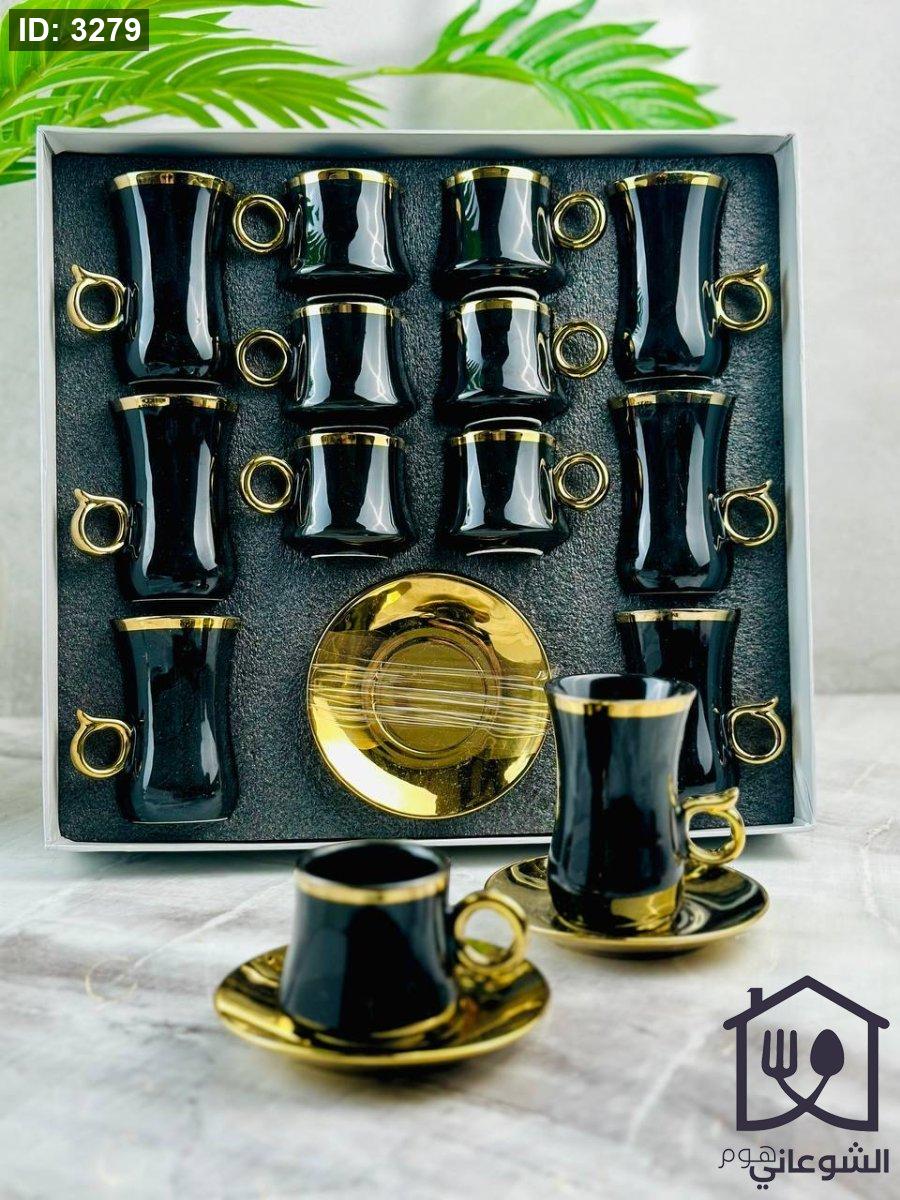 طقم 6 فناجين مع 6 استكانات اسود حز ذهبي