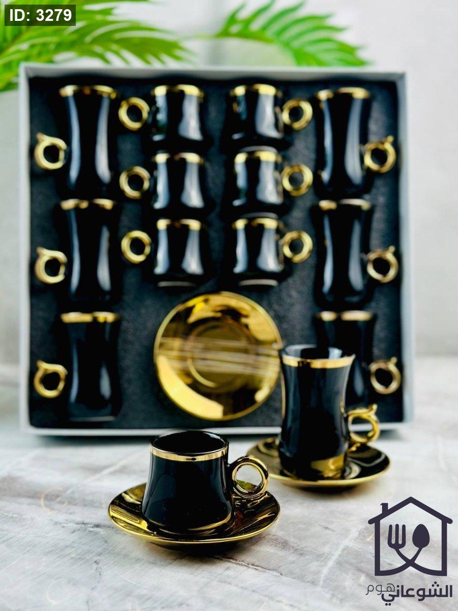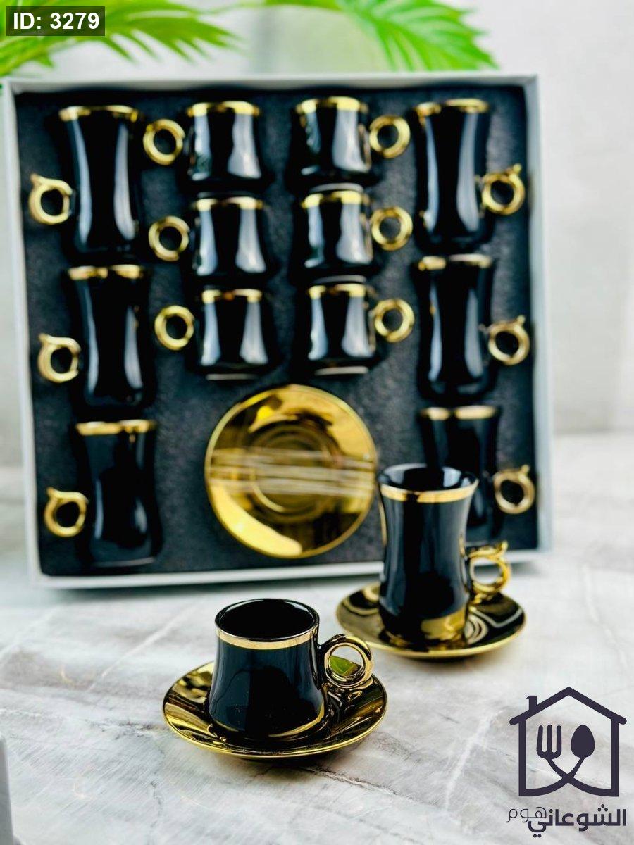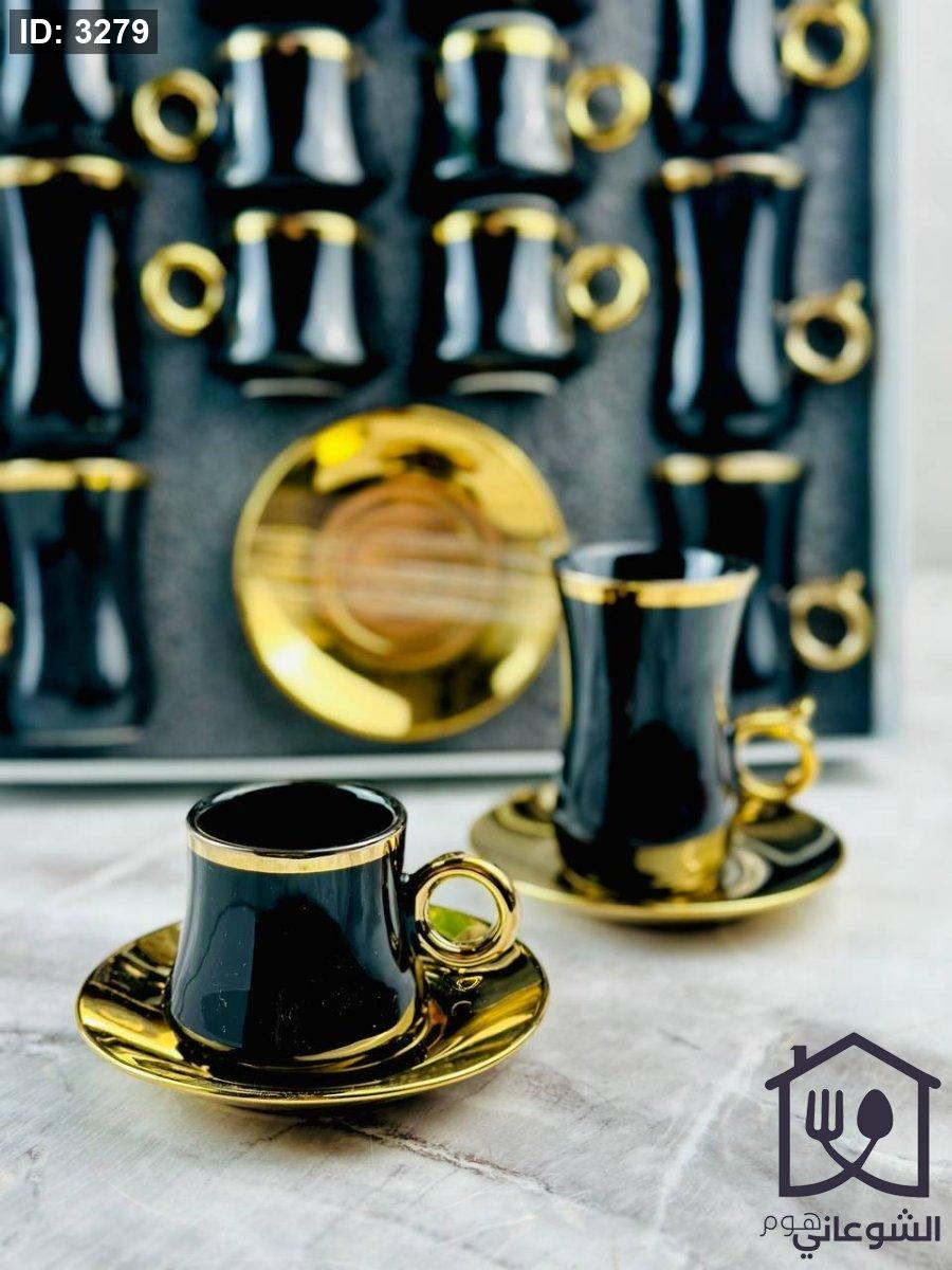 طقم 6 فناجين مع 6 استكانات اسود حز ذهبي