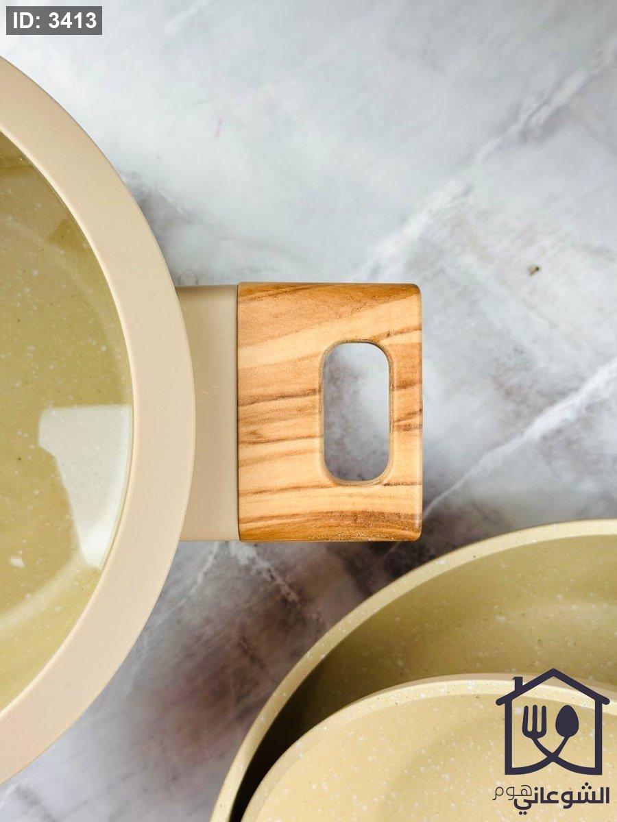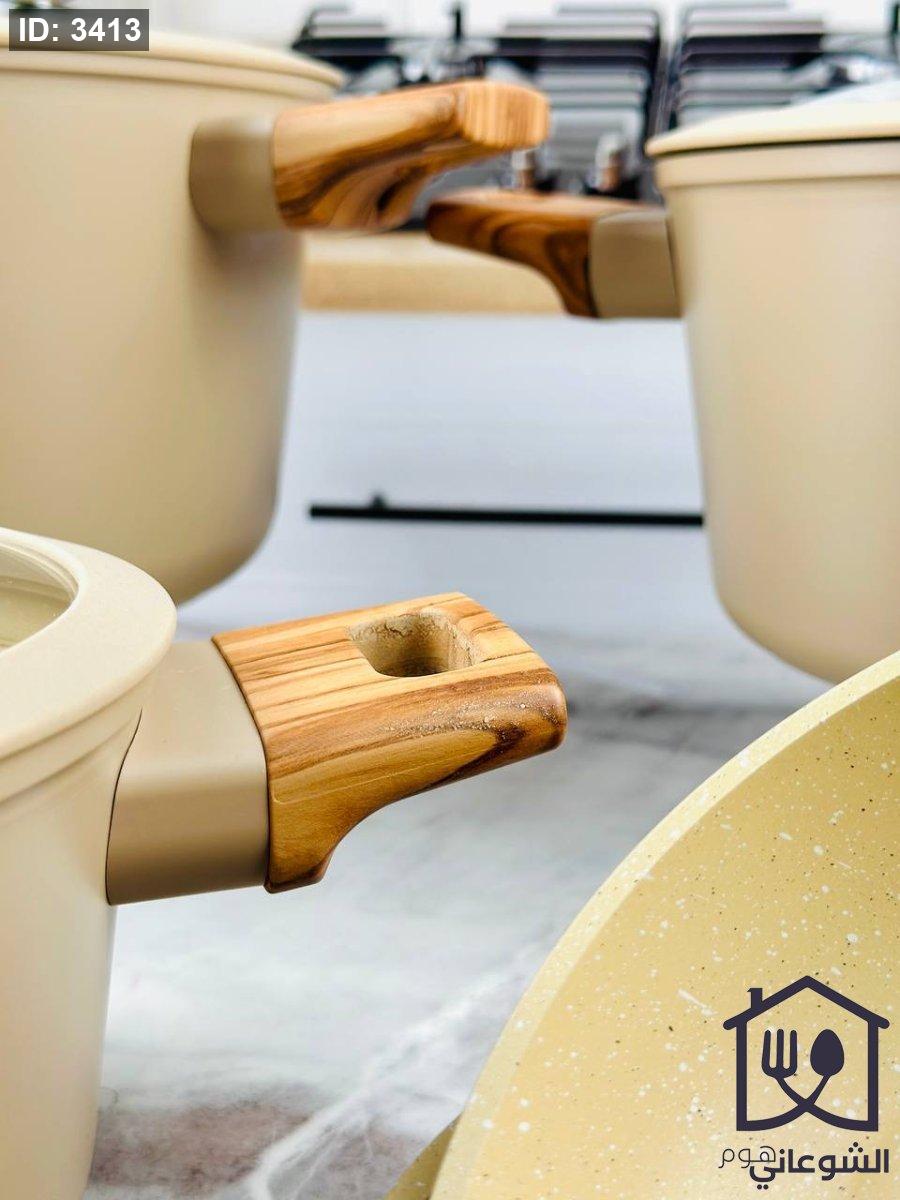 طقم عملي ومريح بالاستعمال بلون سكني أو بيج هادي مع يد خشب أنيقة.