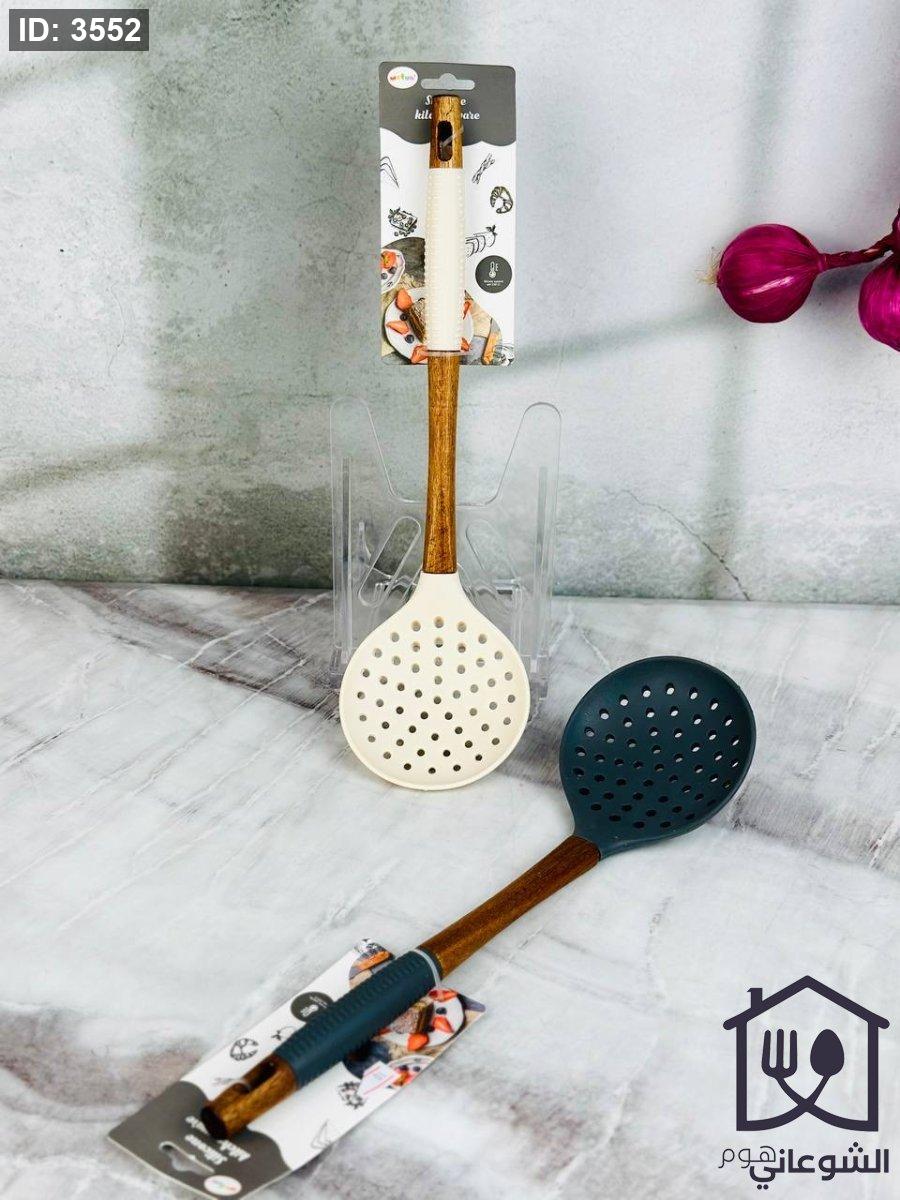 مغرفة سيليكون يد خشب غامق اطار سيليكون مخرم