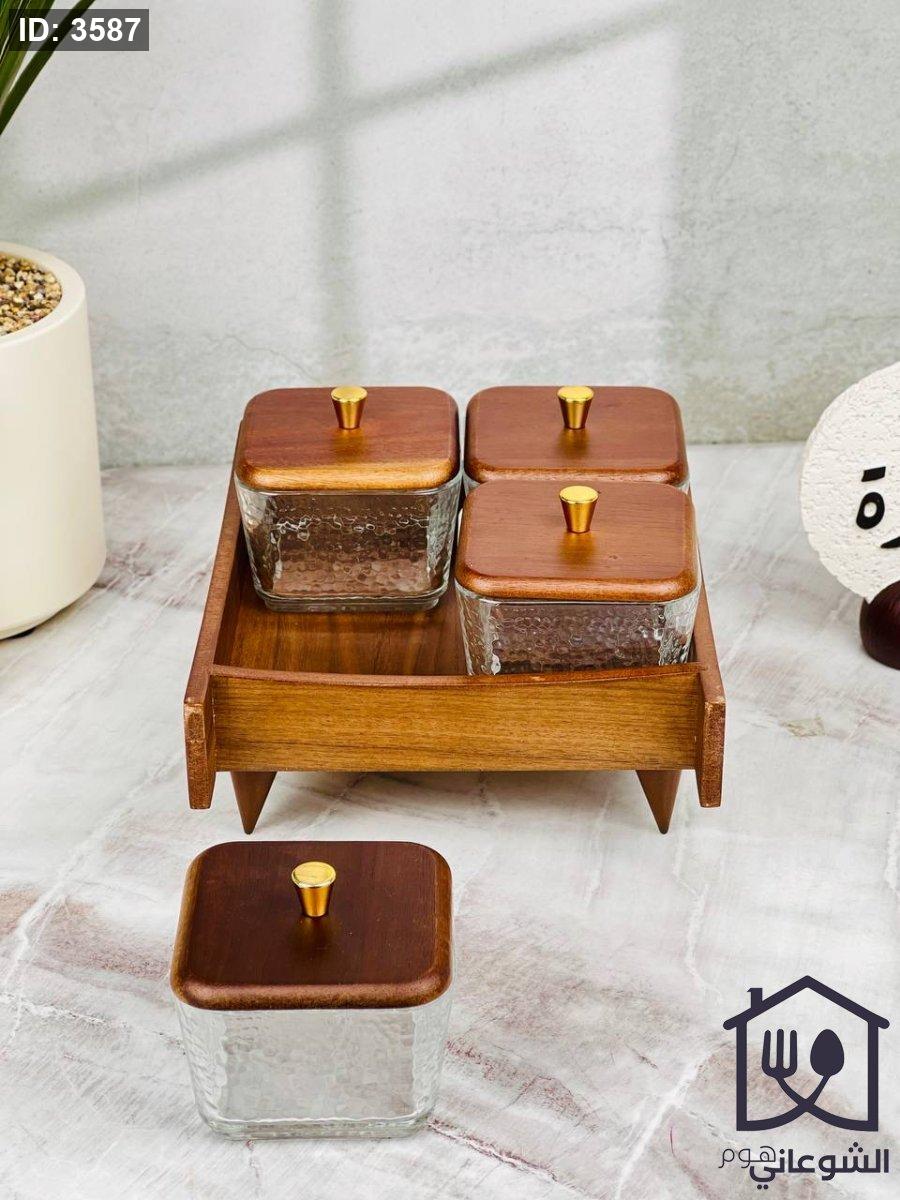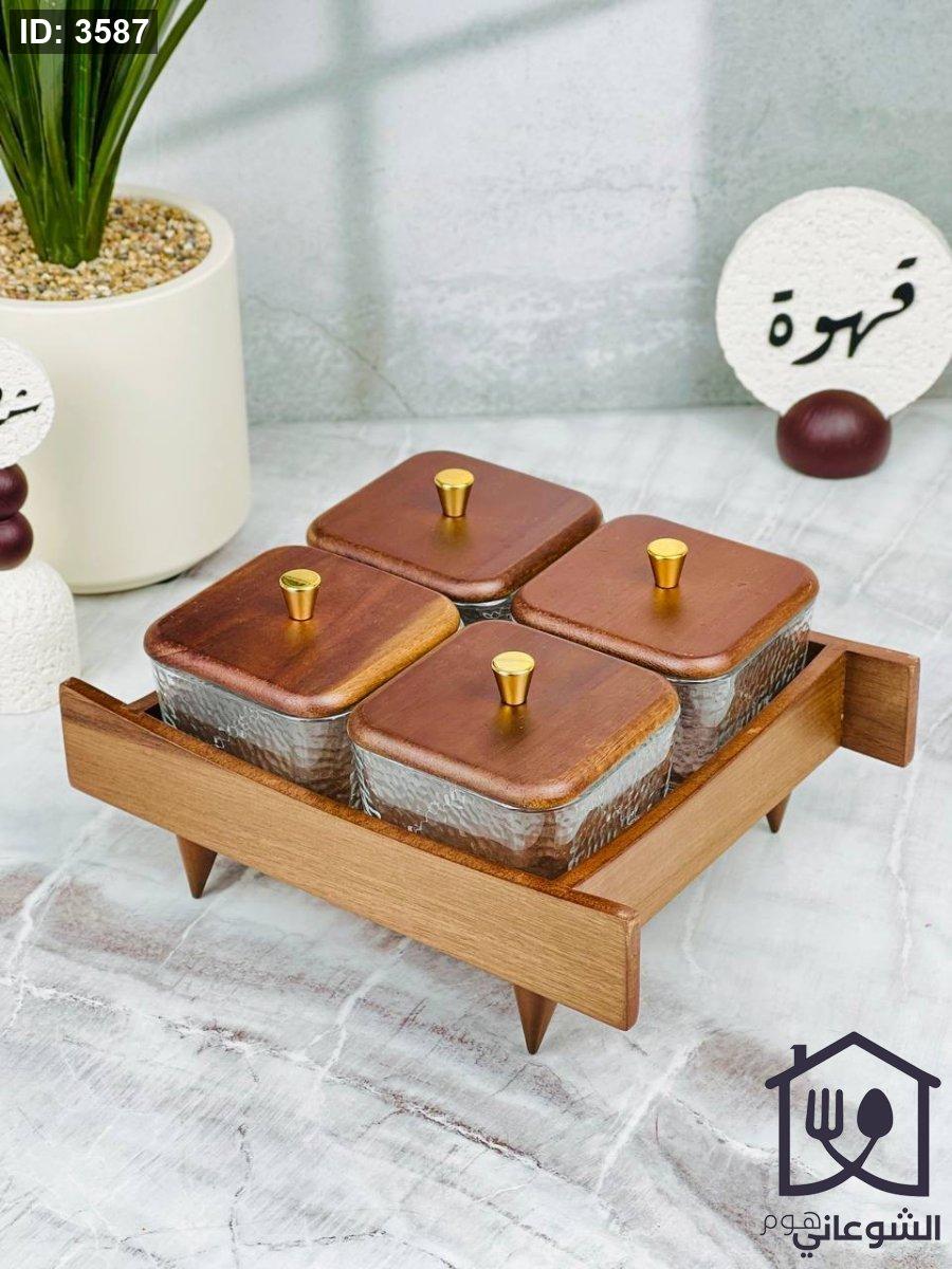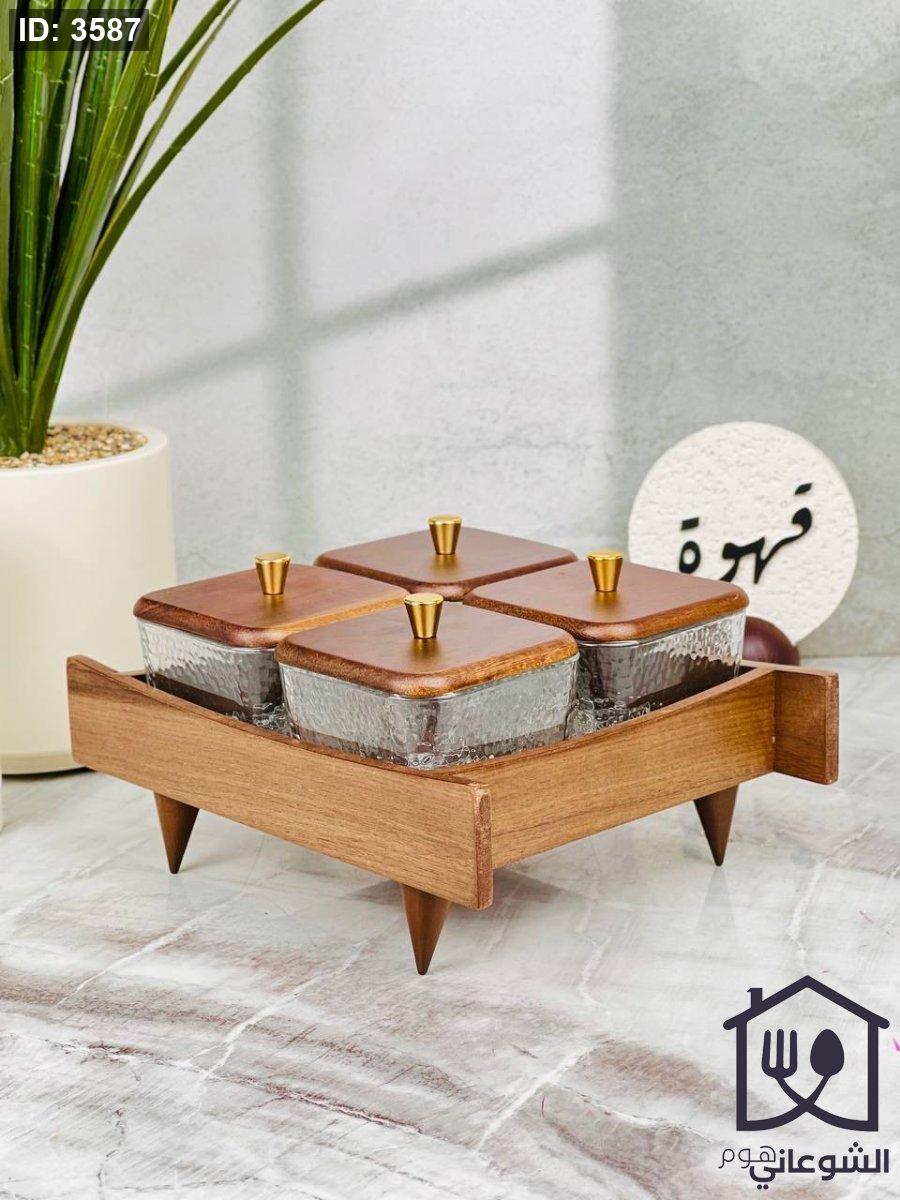 مضيفة مكسرات / حلويات زجاج مبزر 4 قطع مع قاعدة خشب وغطاء