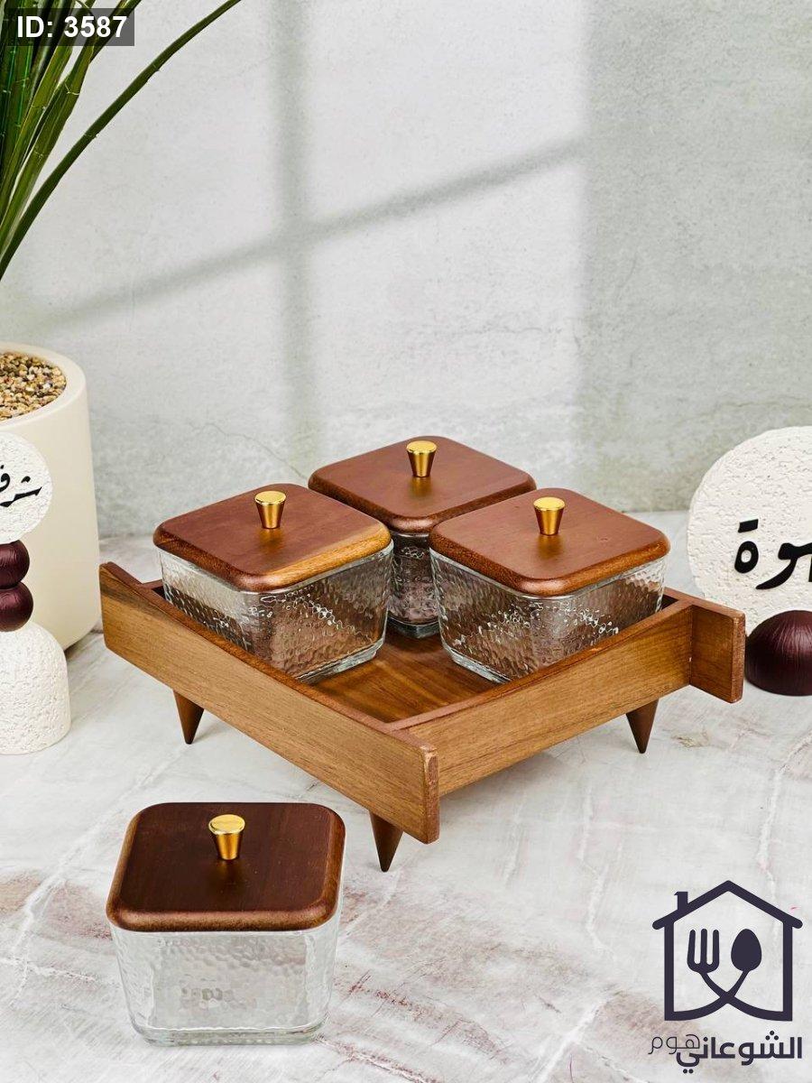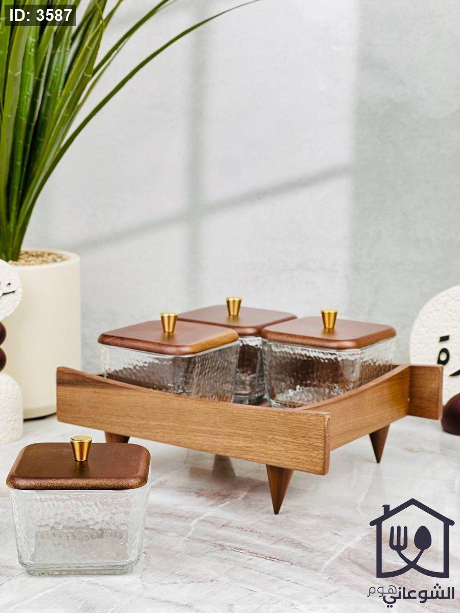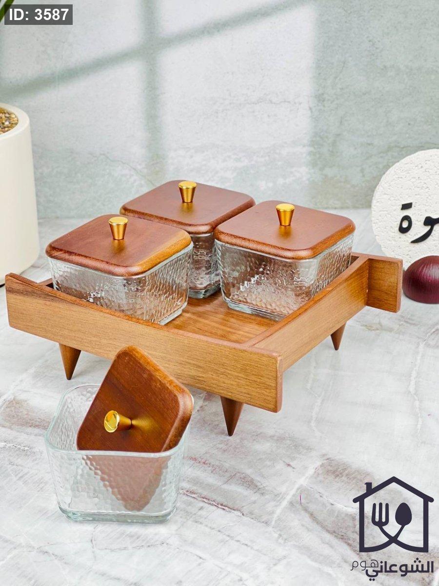 مضيفة مكسرات / حلويات زجاج مبزر 4 قطع مع قاعدة خشب وغطاء