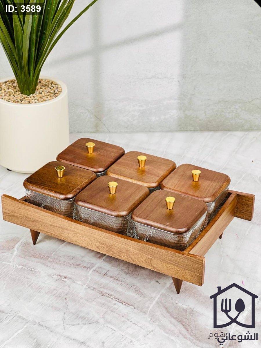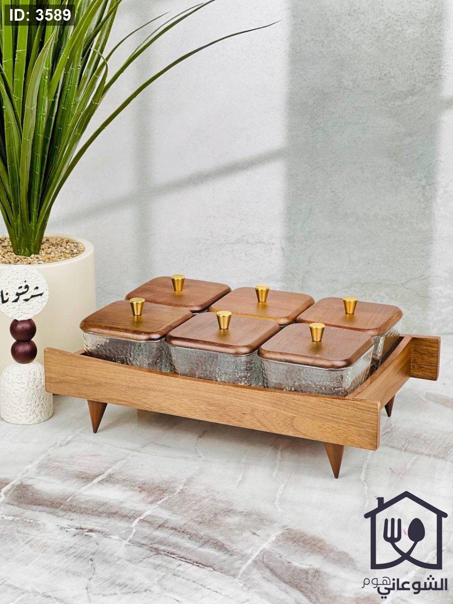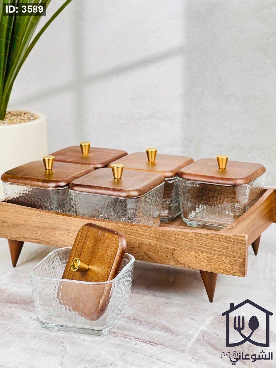 مضيفة مكسرات / حلويات زجاج مبزر 6 قطع مع قاعدة خشب وغطاء