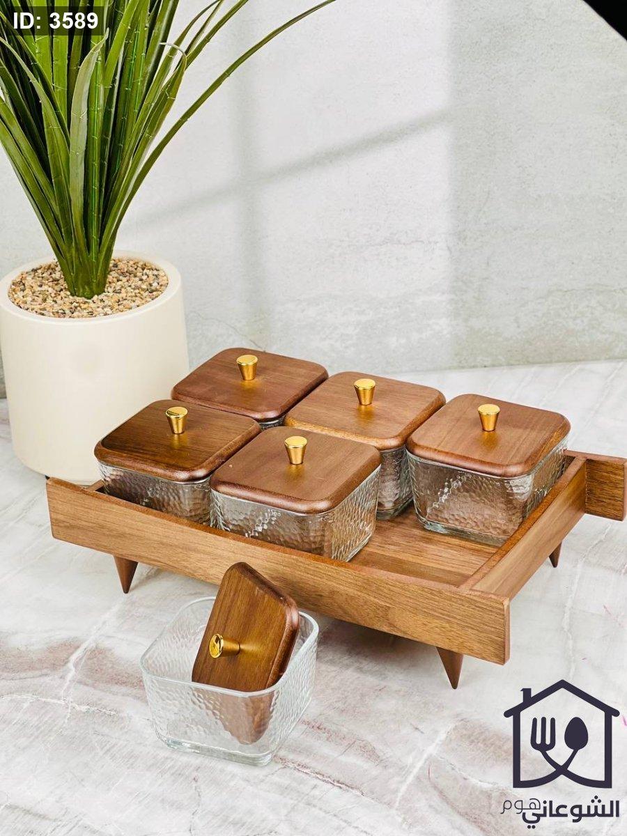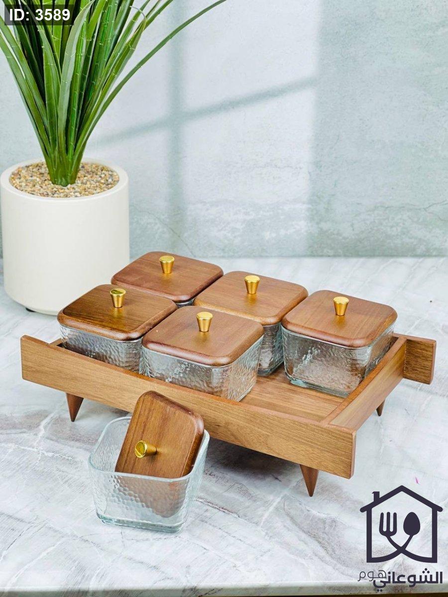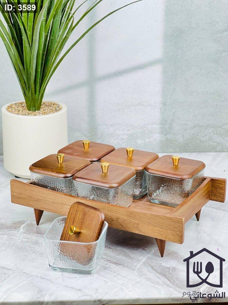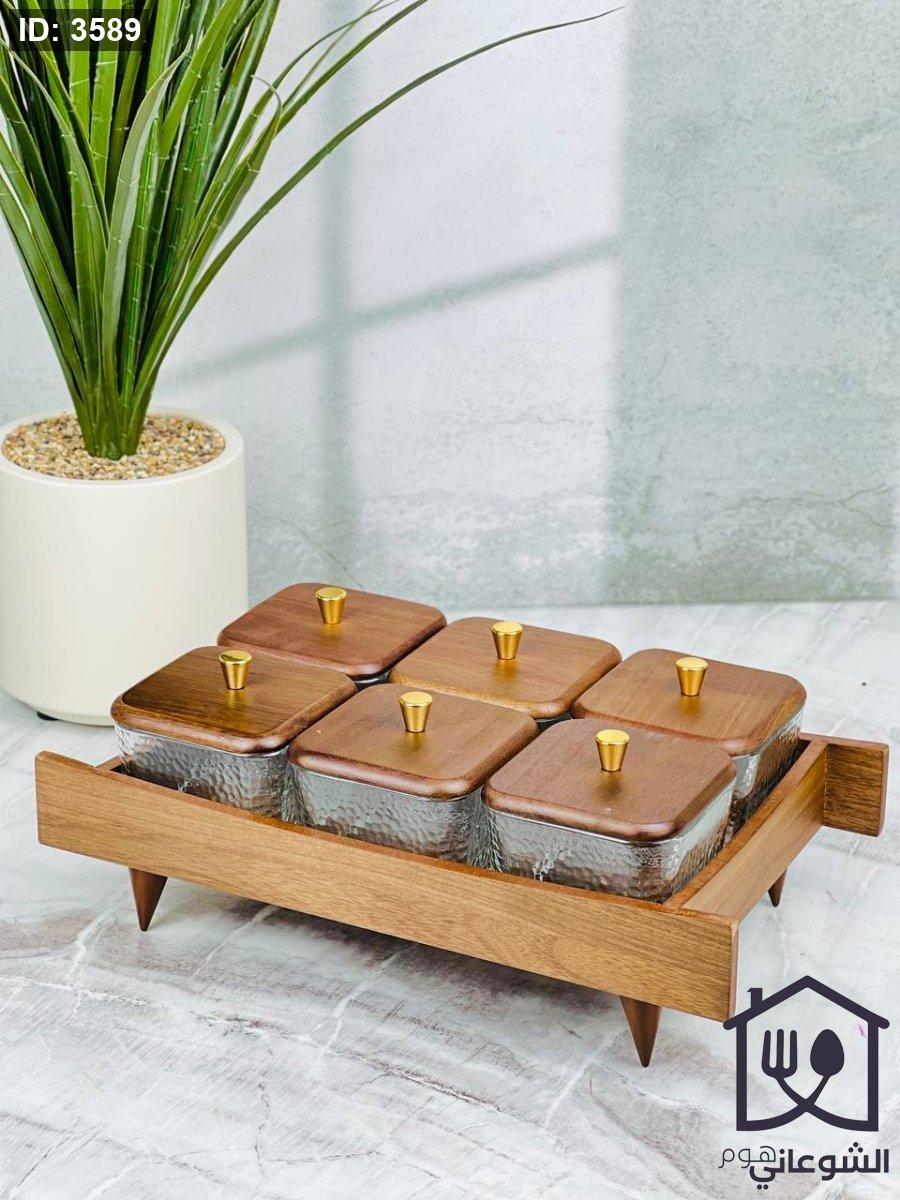 مضيفة مكسرات / حلويات زجاج مبزر 6 قطع مع قاعدة خشب وغطاء