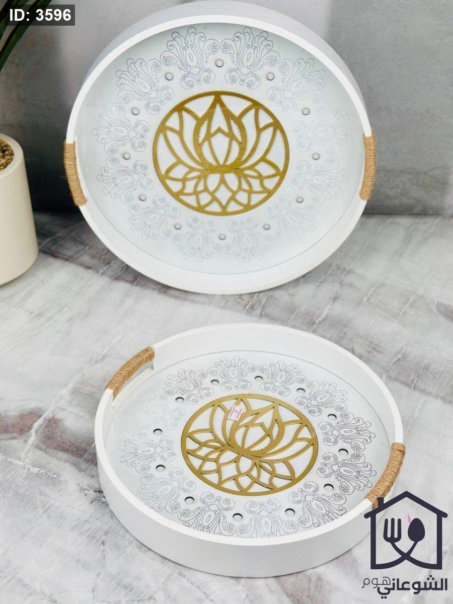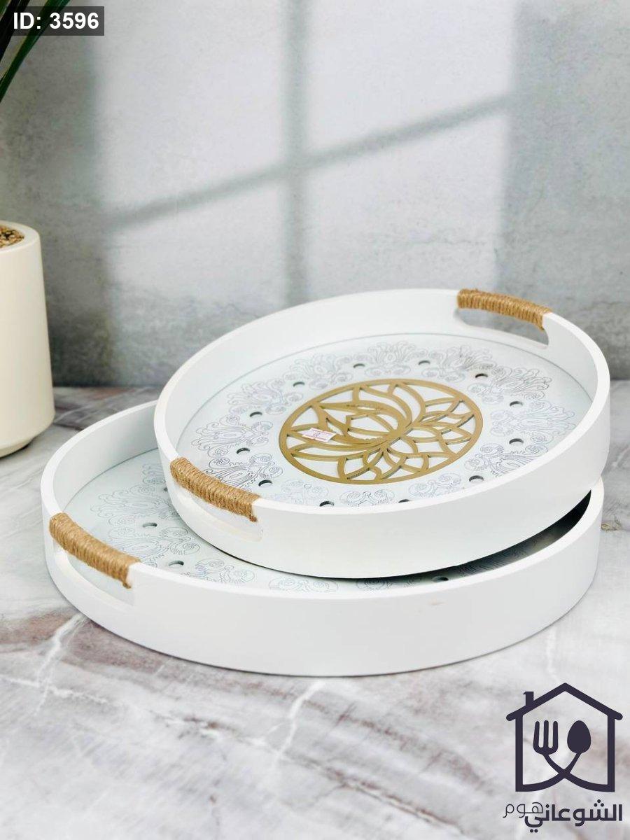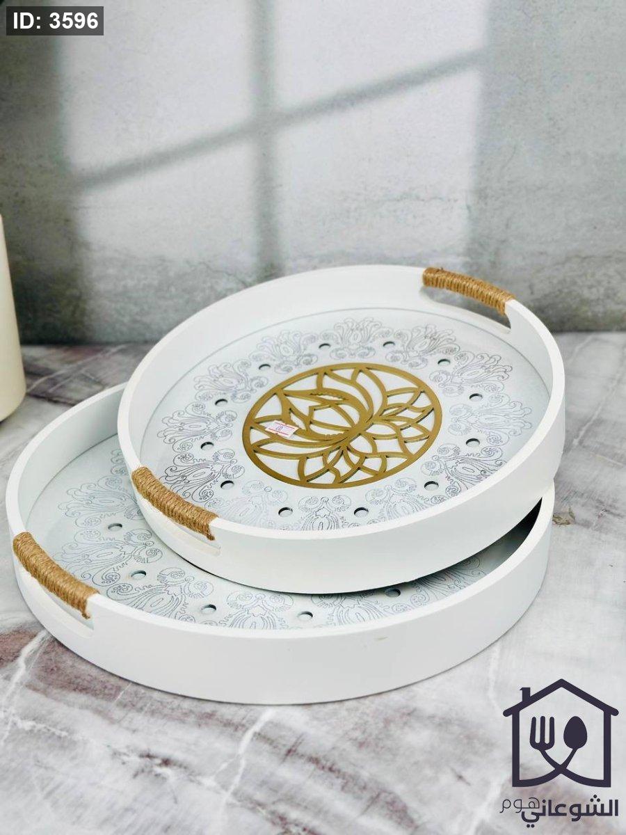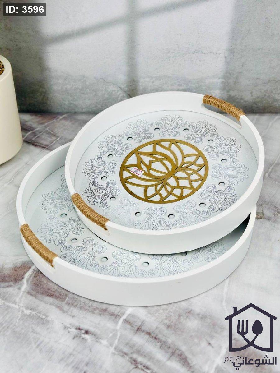 طقم صواني خشب دائري قاعدة زجاج مزغرفة ابيض