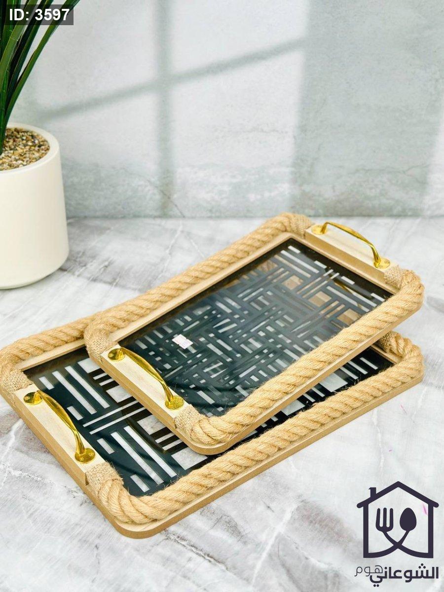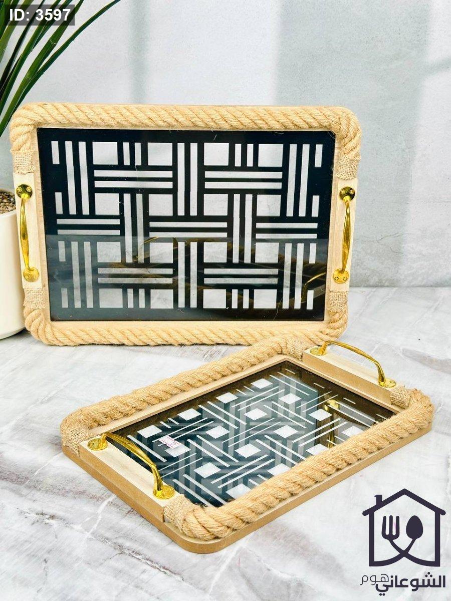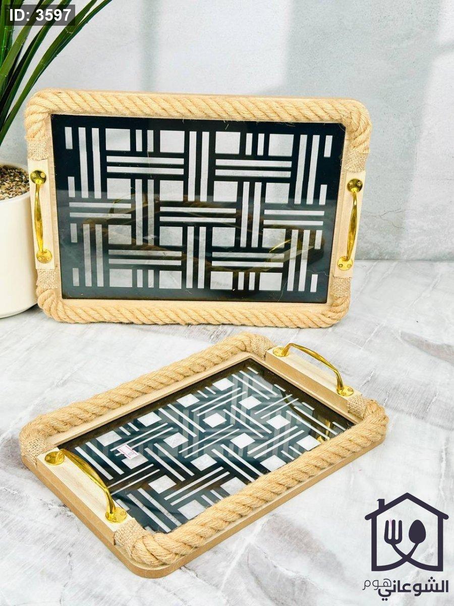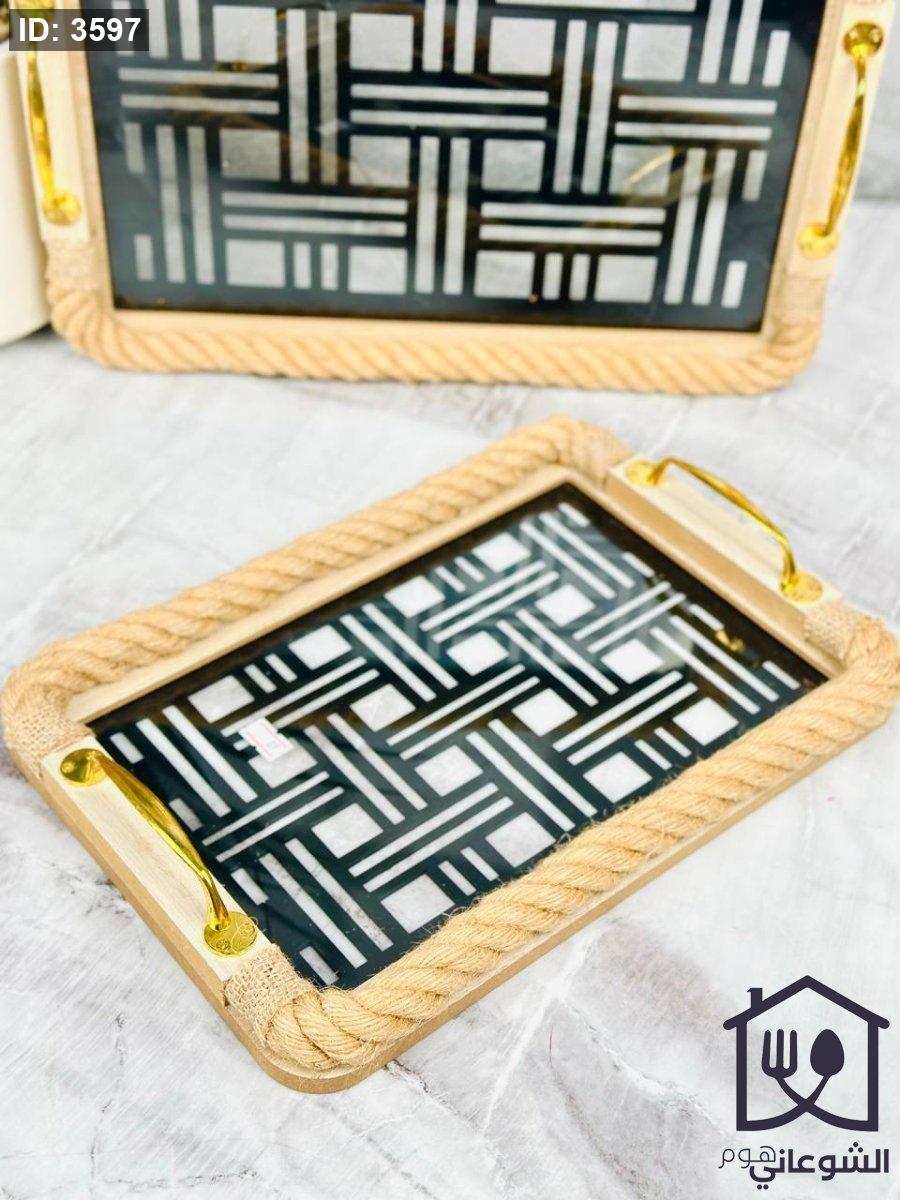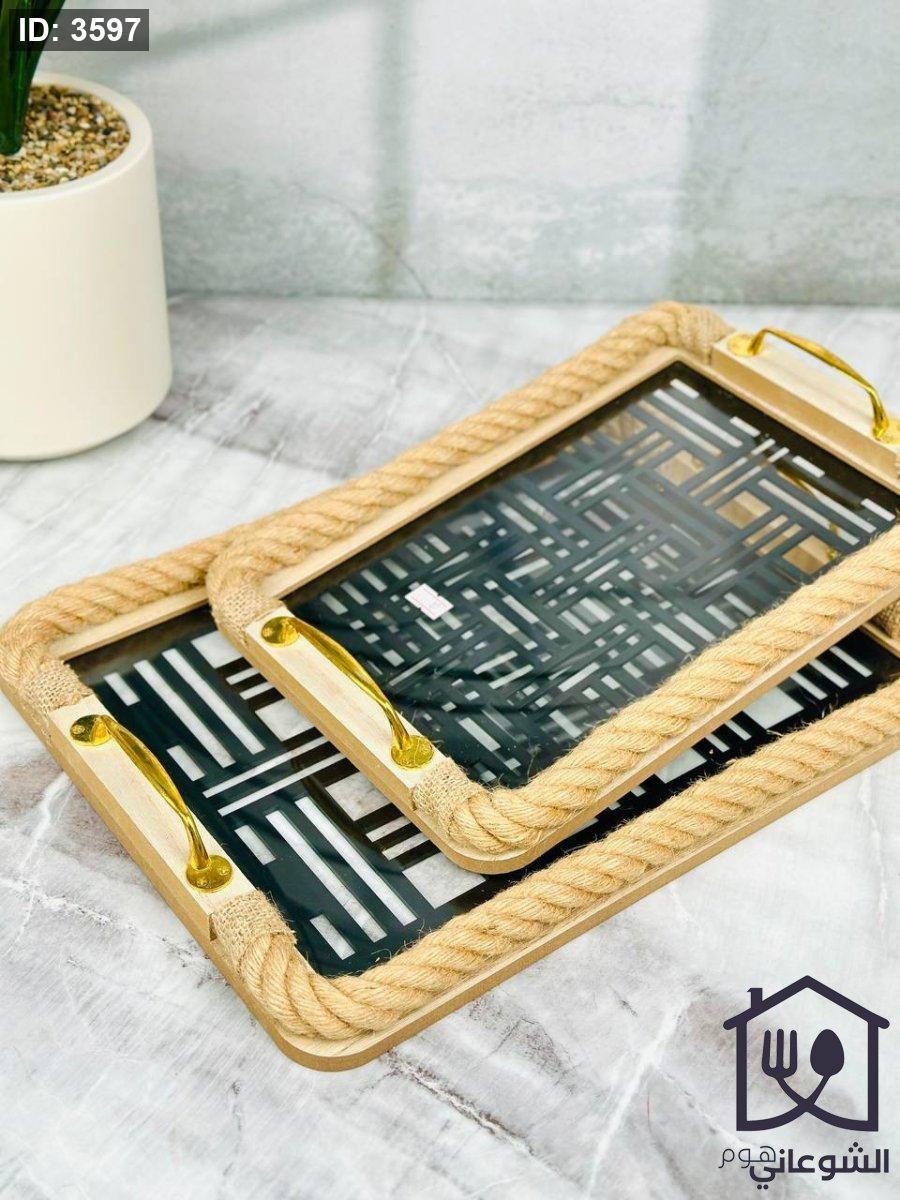 طقم صواني تقديم مستطيلة خشب اطار قش قاعد اسود مخطط