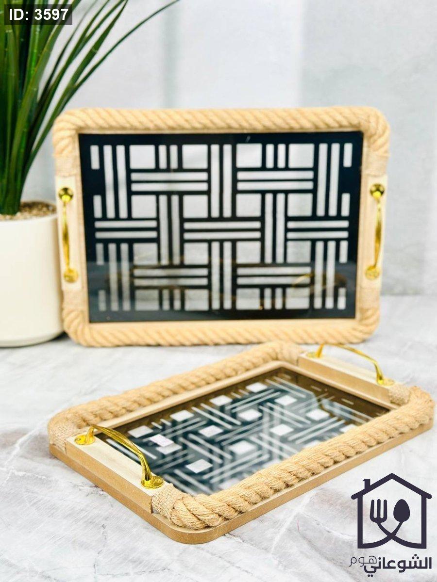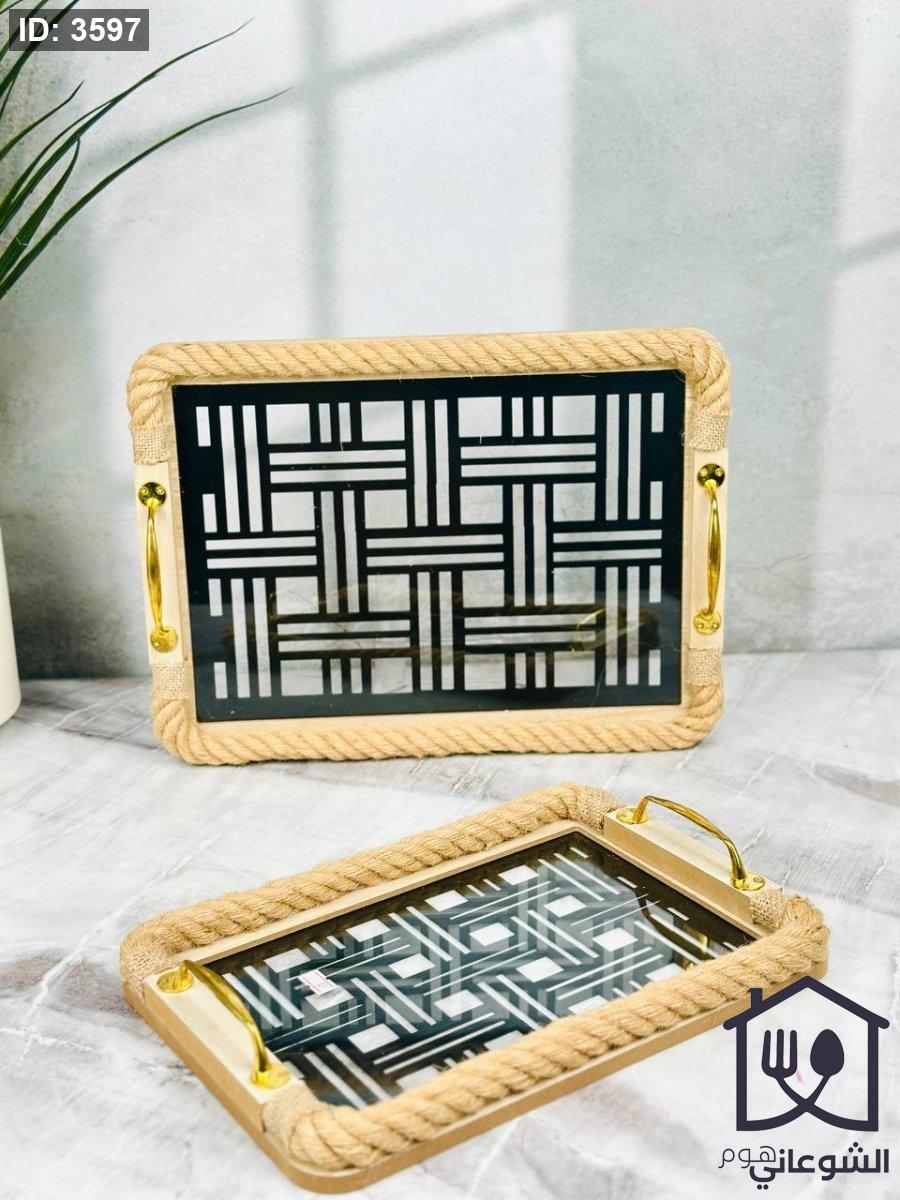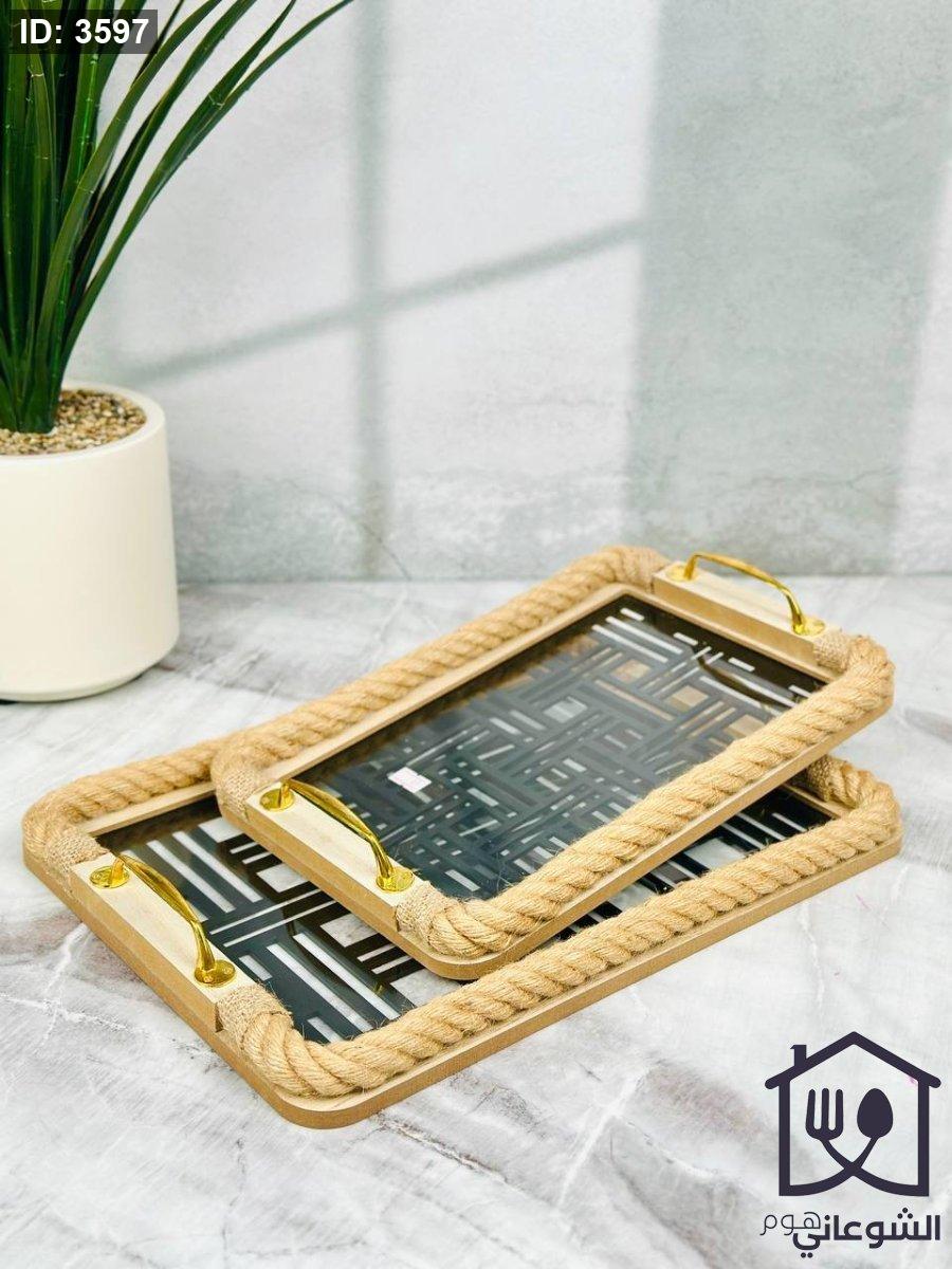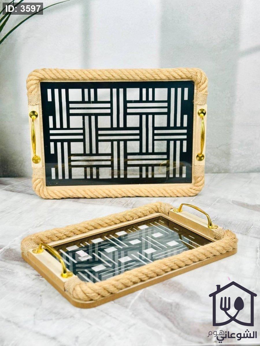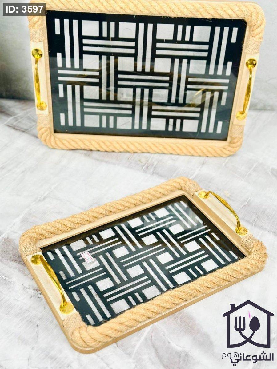 طقم صواني تقديم مستطيلة خشب اطار قش قاعد اسود مخطط