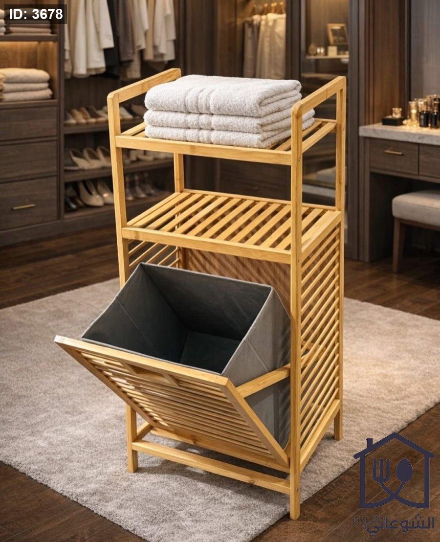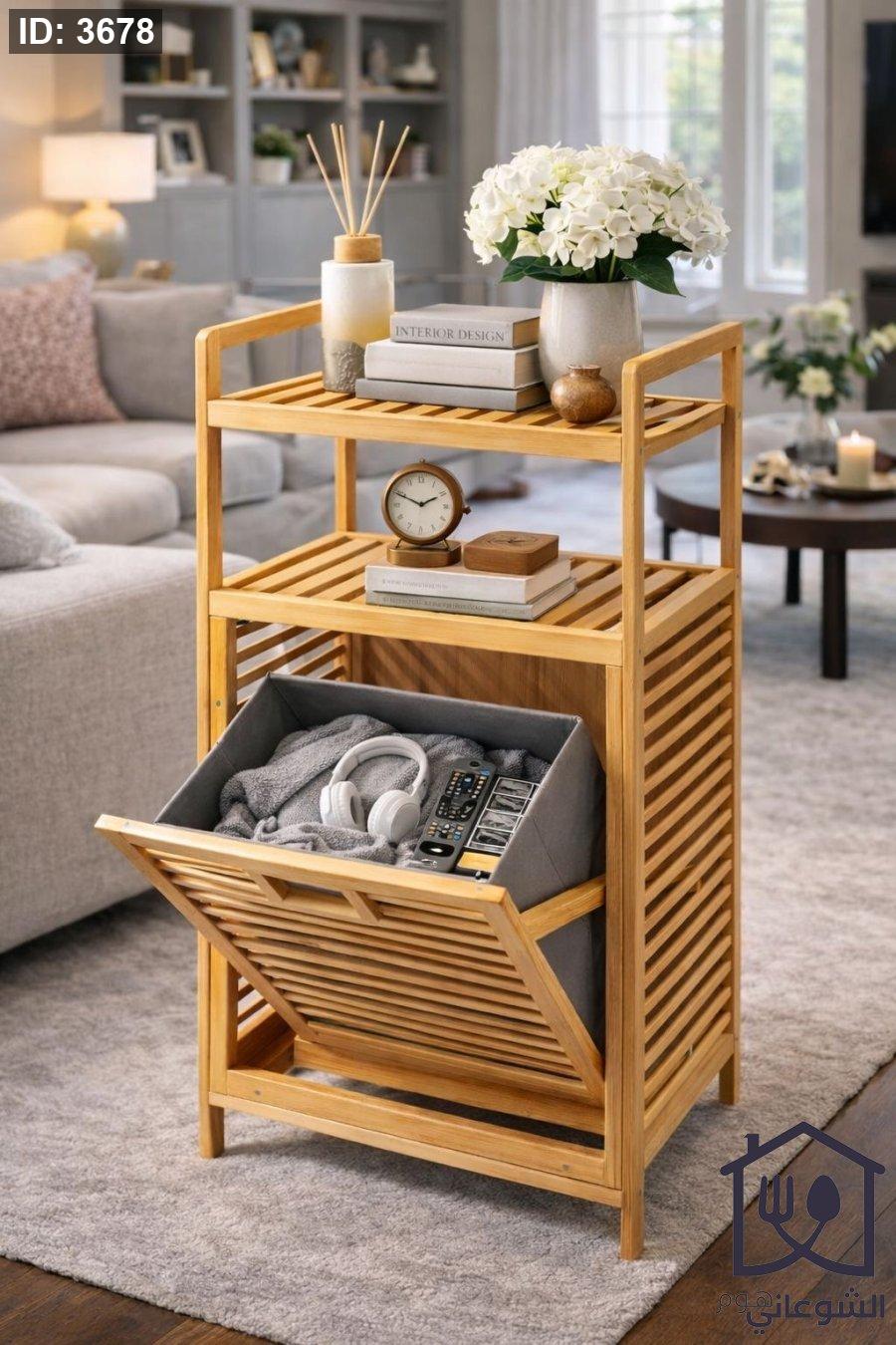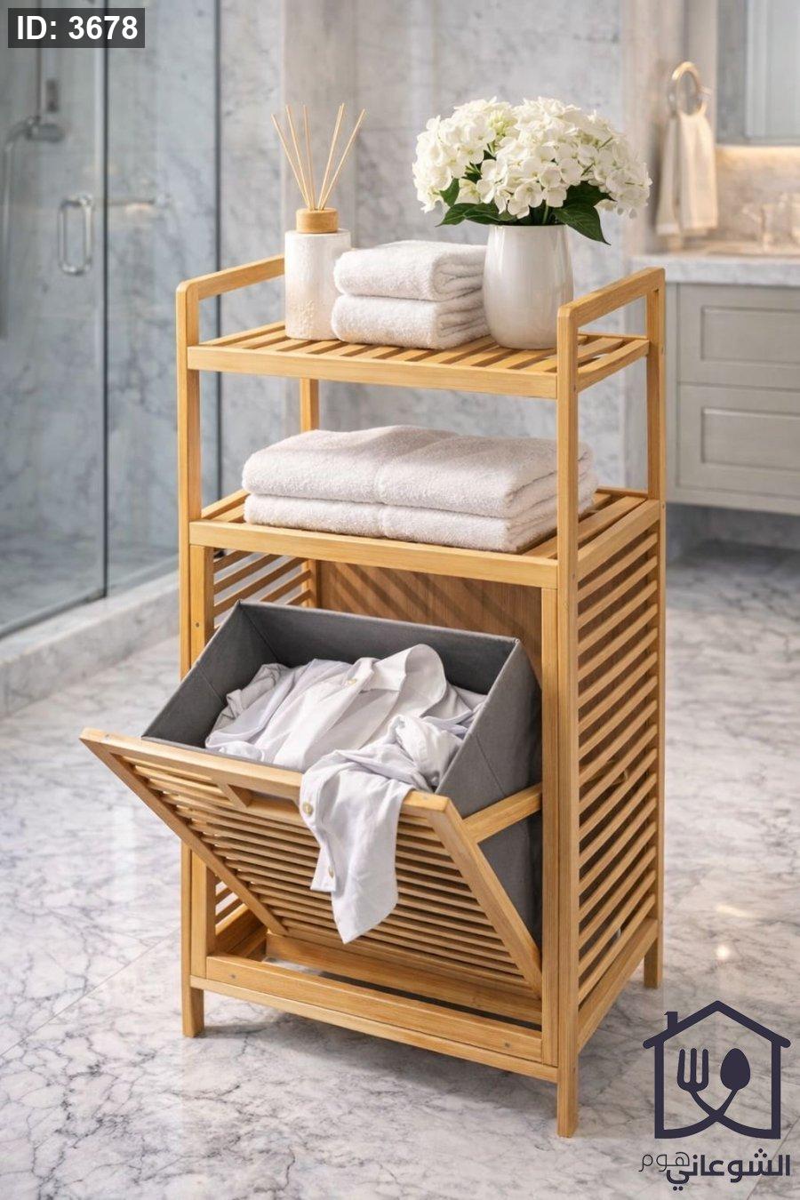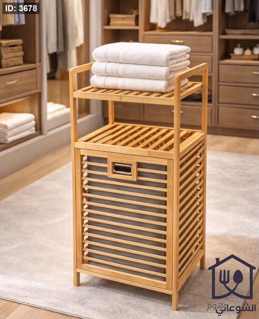 رف خشب بامبو 2 طبقة مع سلة مبطن قماش متعدد الاستخدامات حمام - غرفة معيشة - غرفة نوم