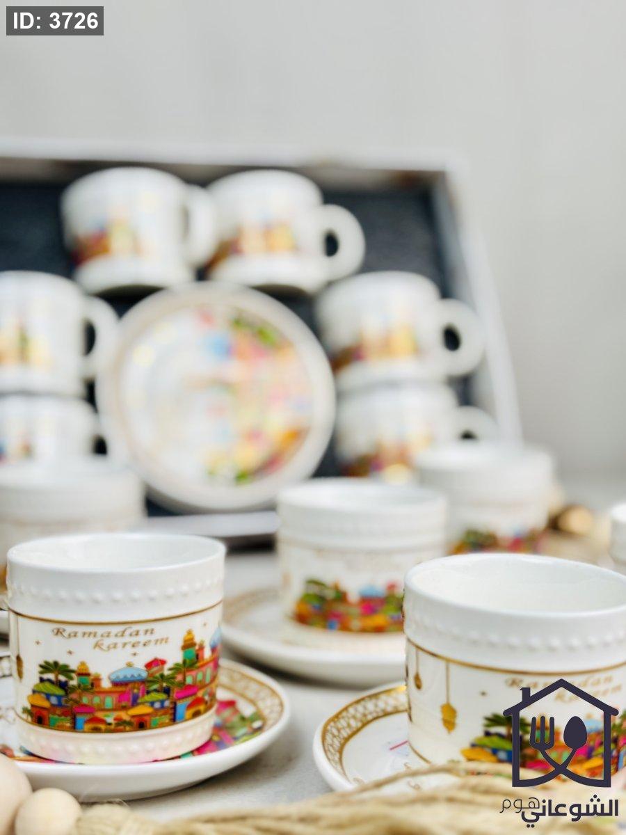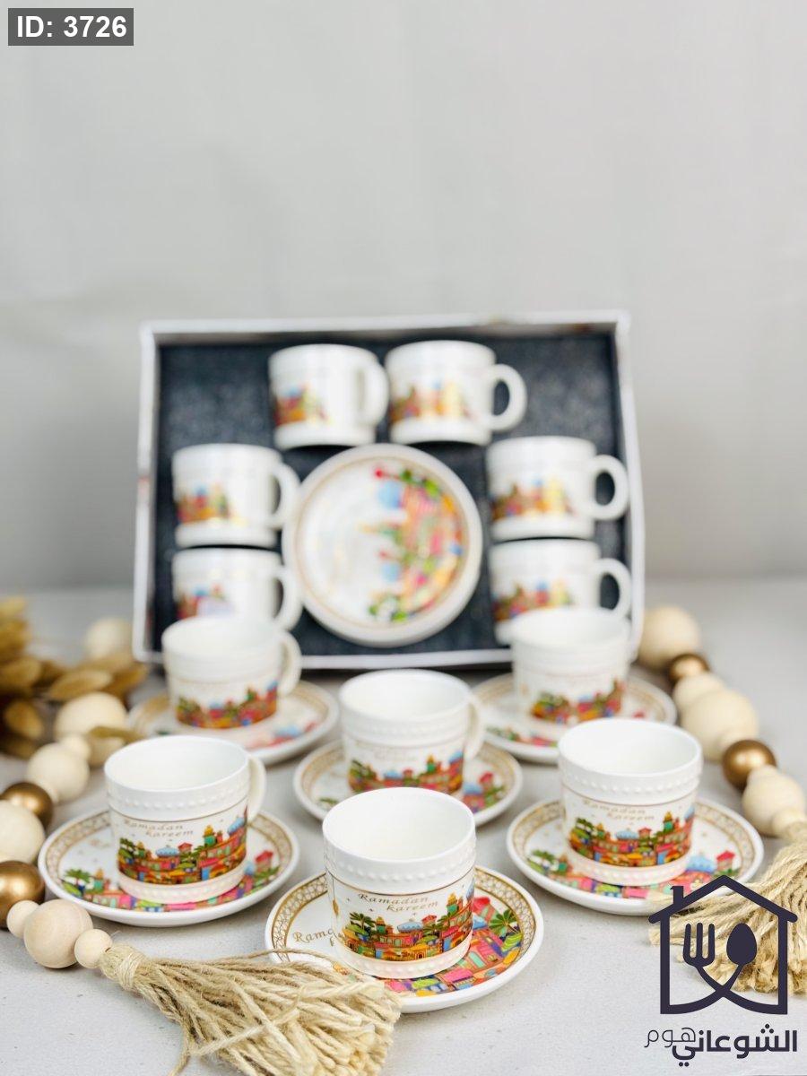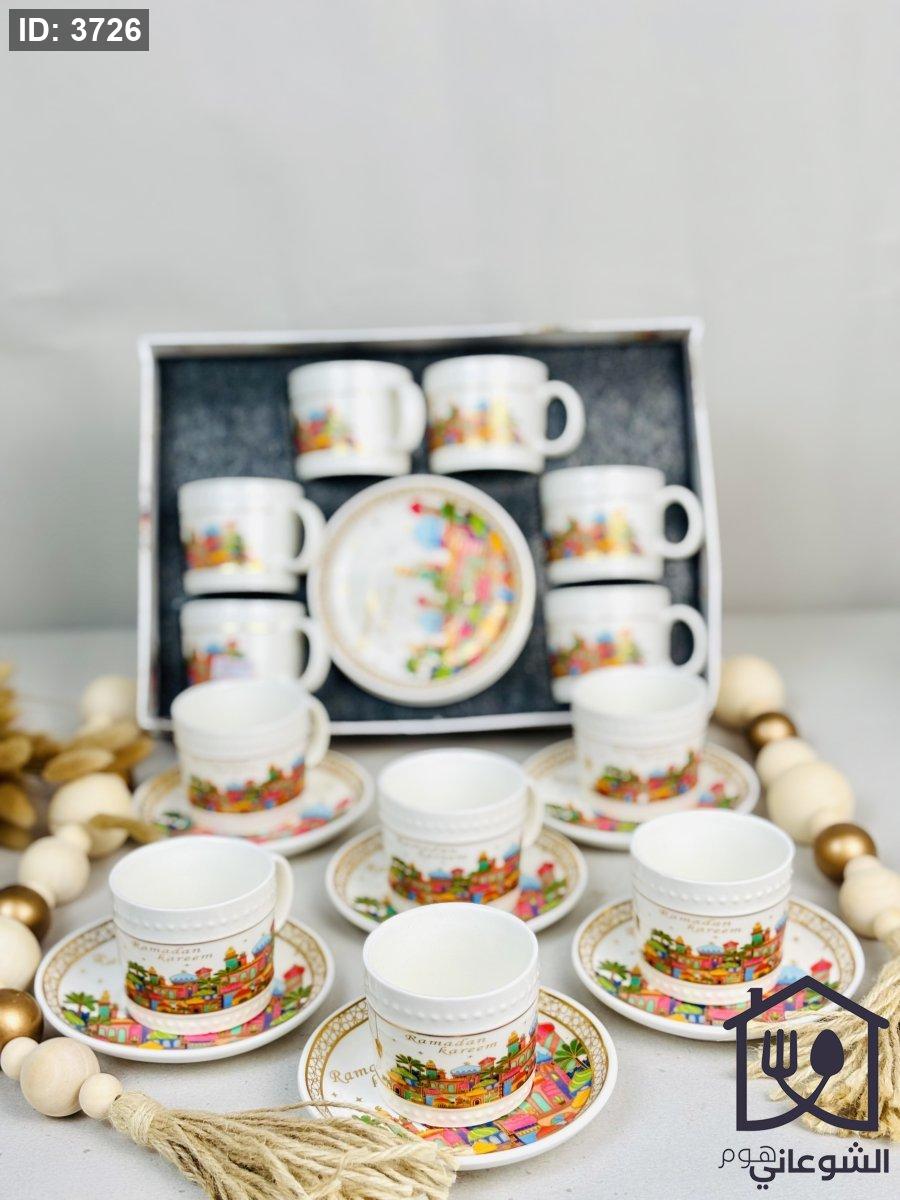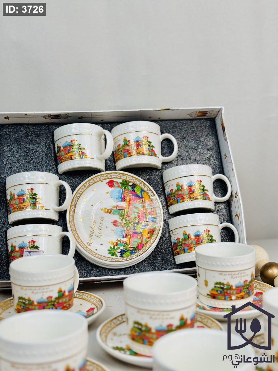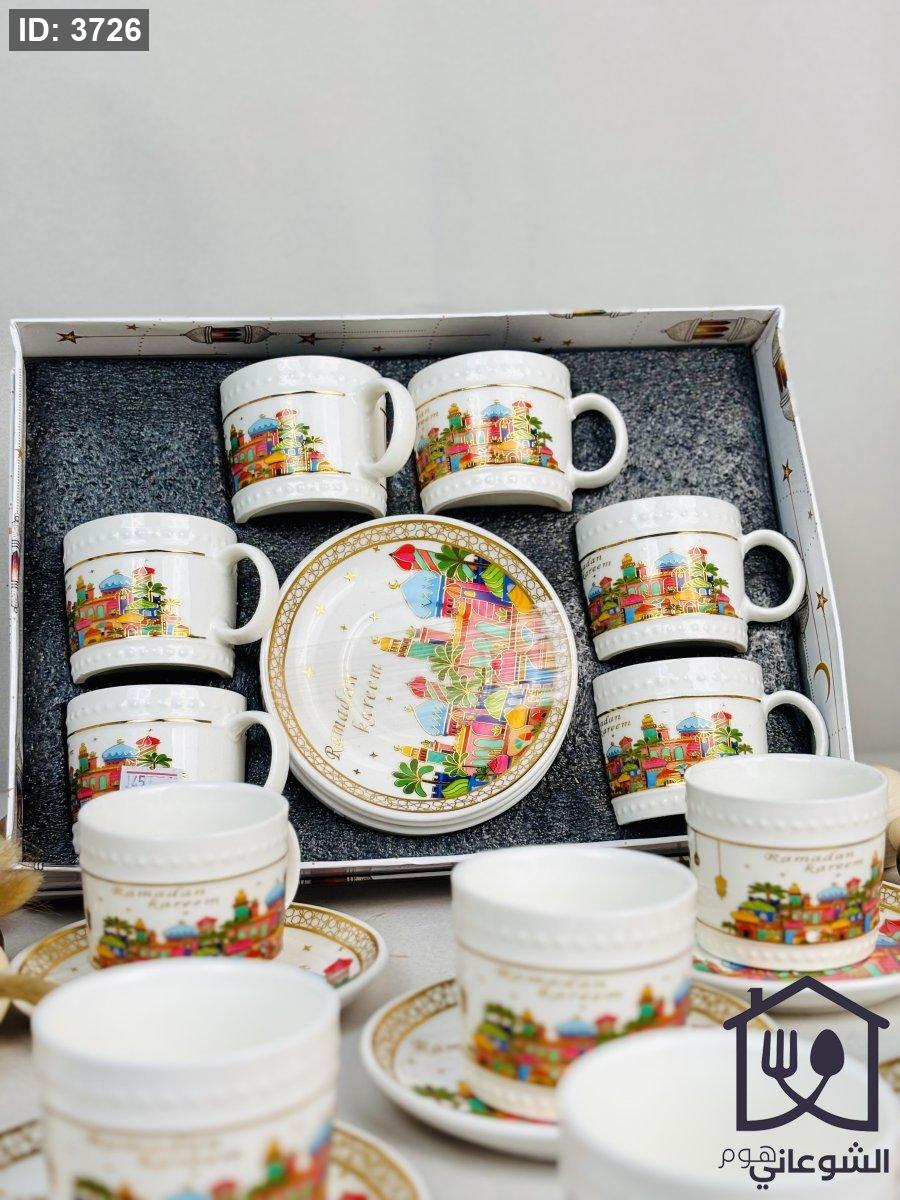 طقم فناجين مرسم مغربي ملون وذهبي 6 فناجين مع 6 صحون