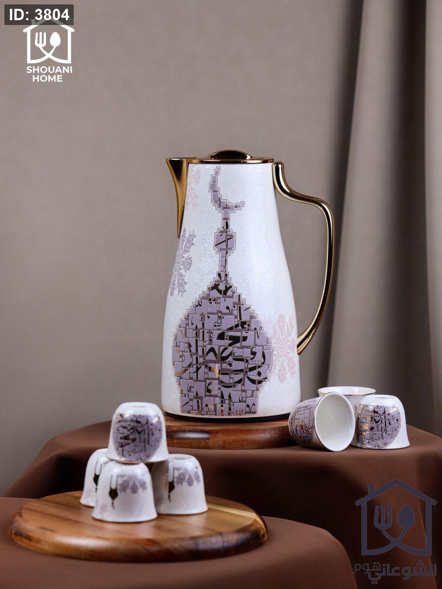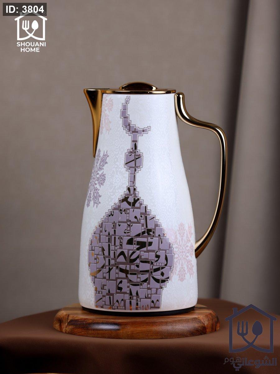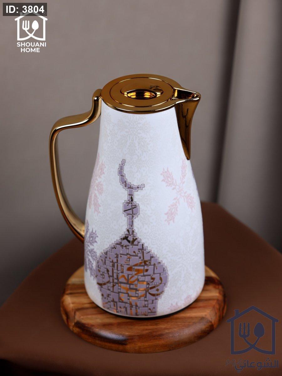 دلة قهوة بورسلان اوف وايت مع ذهبي مرسم شكل مسجد كتابة ( بالمحبة )
