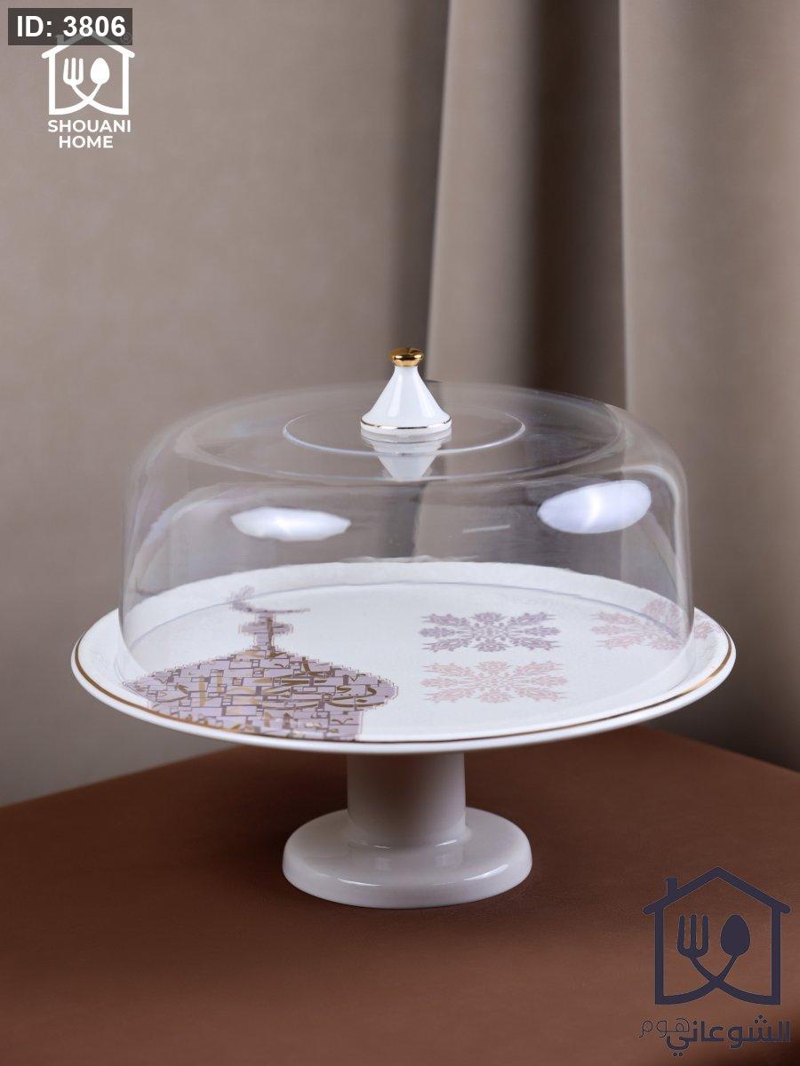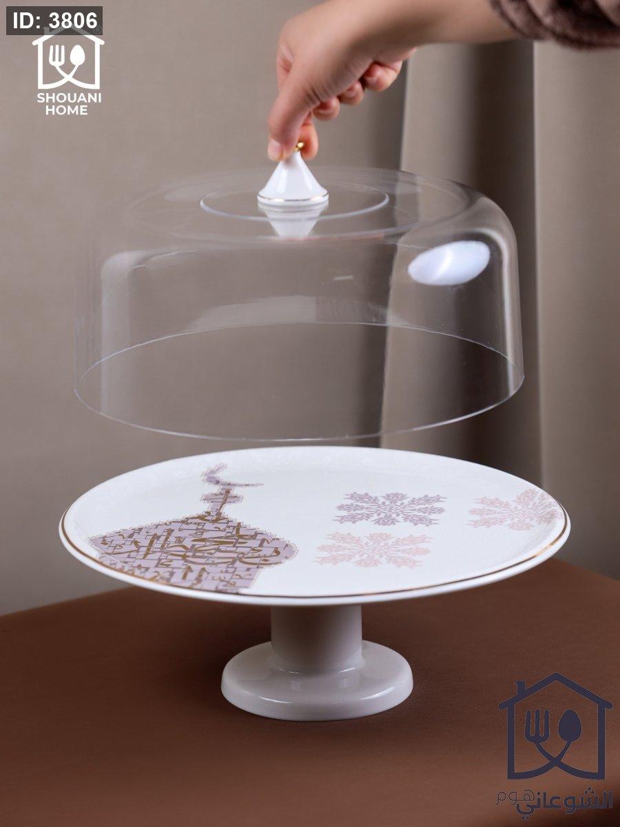 جاط كيك بورسلان اوف وايت مع قاعدة وغطاء اكروليك حز ذهبي مرسم شكل مسجد كتابة ( بالمحبة )