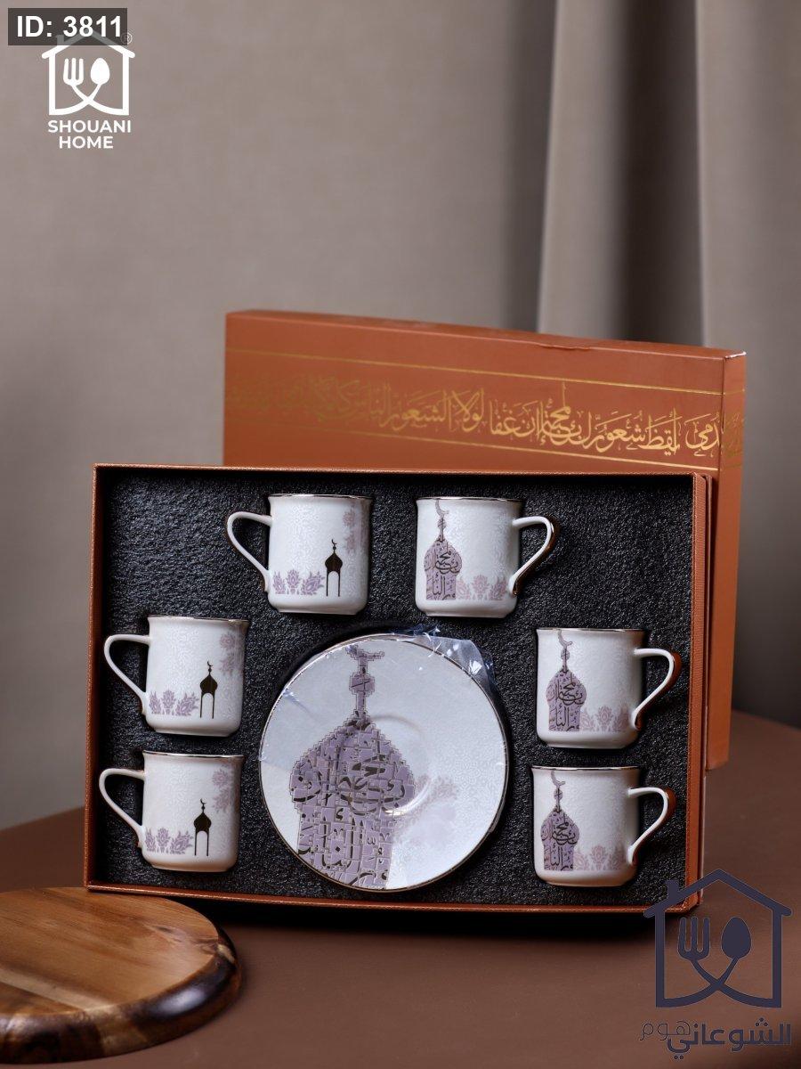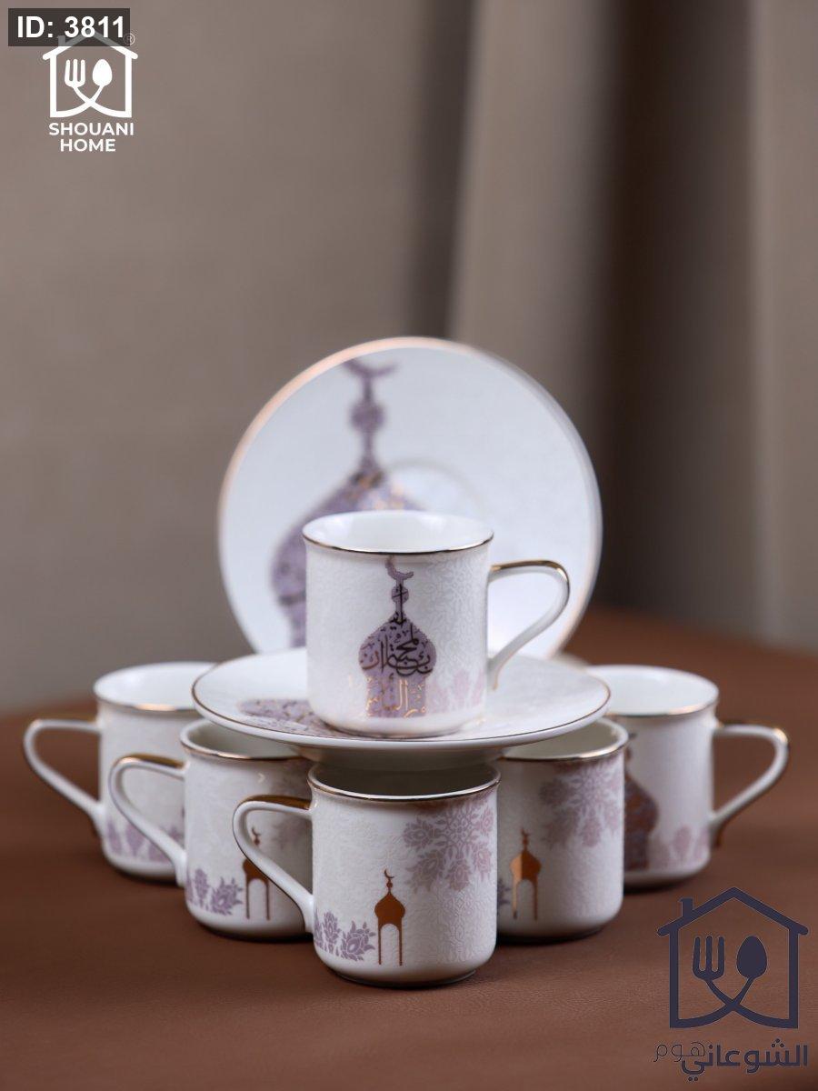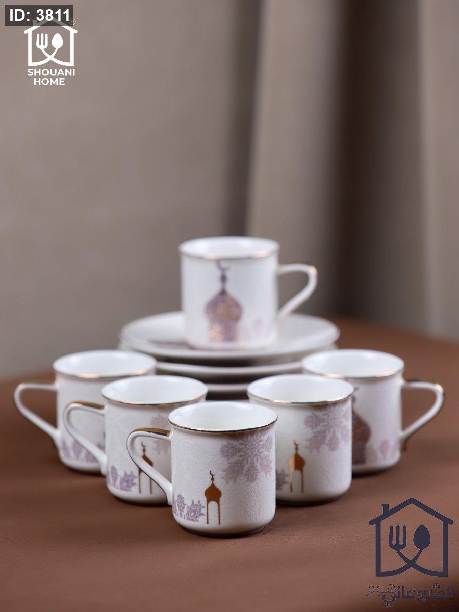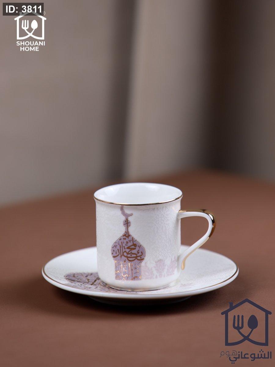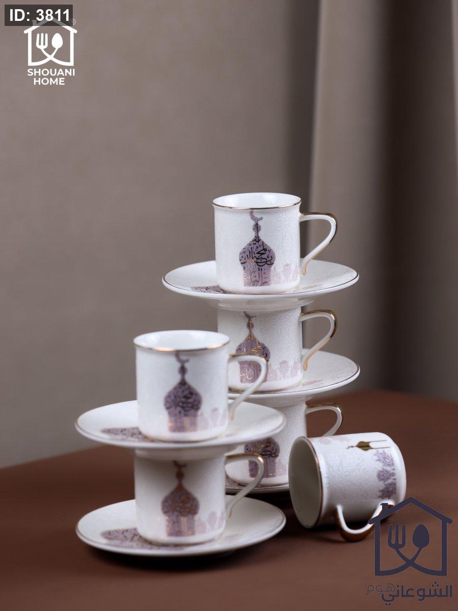 طقم 6 فناجين قهوة مع 6 صحون اوف وايت محزز ذهبي مرسم شكل مسجد كتابة ( بالمحبة )
