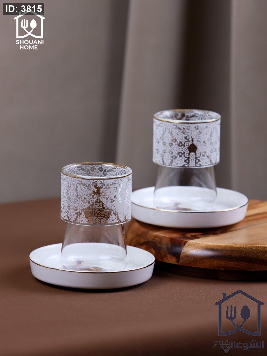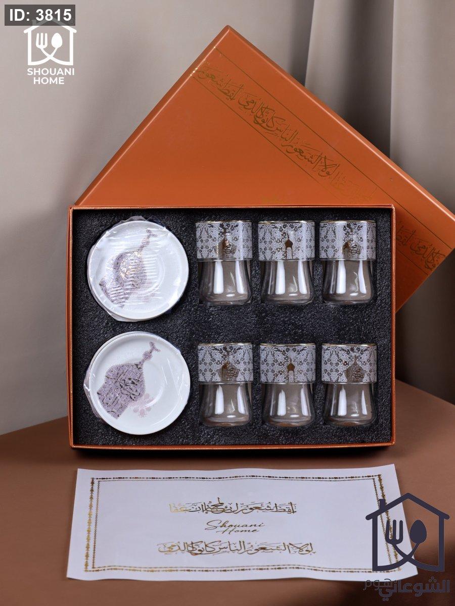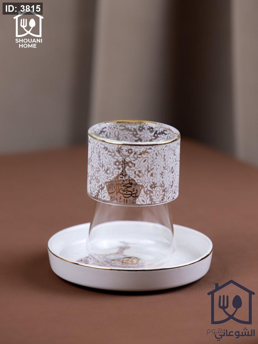 طقم 6 كاسات / استكانات شاي شفاف دبل جلاس مع 6 صحون اوف وايت حز ذهبي مرسم شكل مسجد كتابة ( بالمحبة )