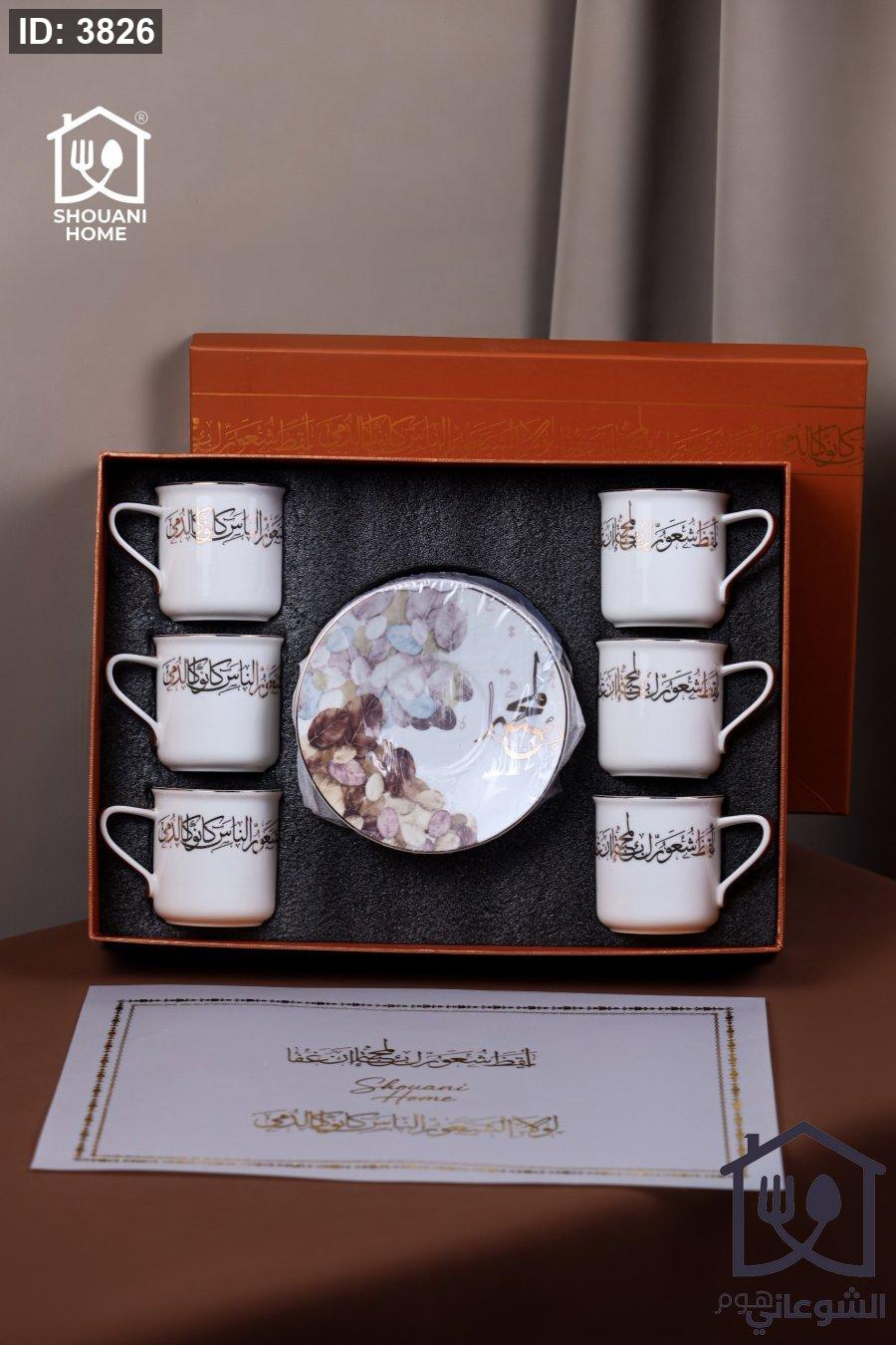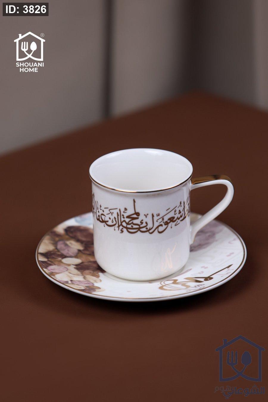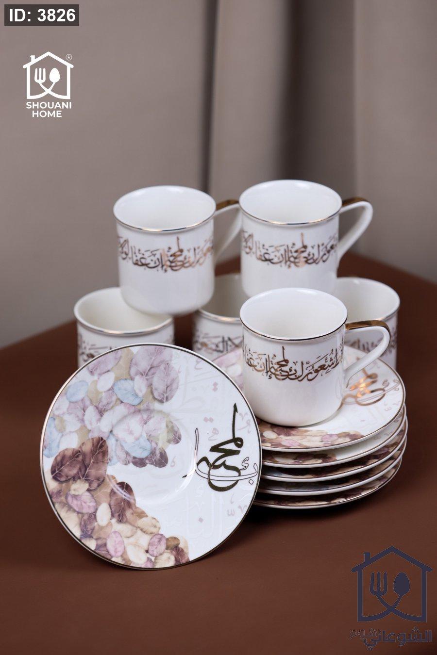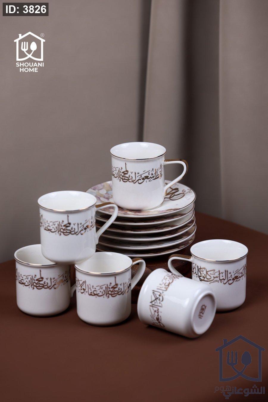طقم 6 كاسات / فناجين / مجات شاي مع 6 صحون اوف وايت محزز ذهبي مورد شكل مسجد كتابة { أيْقِظْ شُعُورَ الْمَحَبَّةِ إِنْ غَفَا لَوْلَا شُعُورُ النَّاسِ كَانُوا كَالدُّمَى}