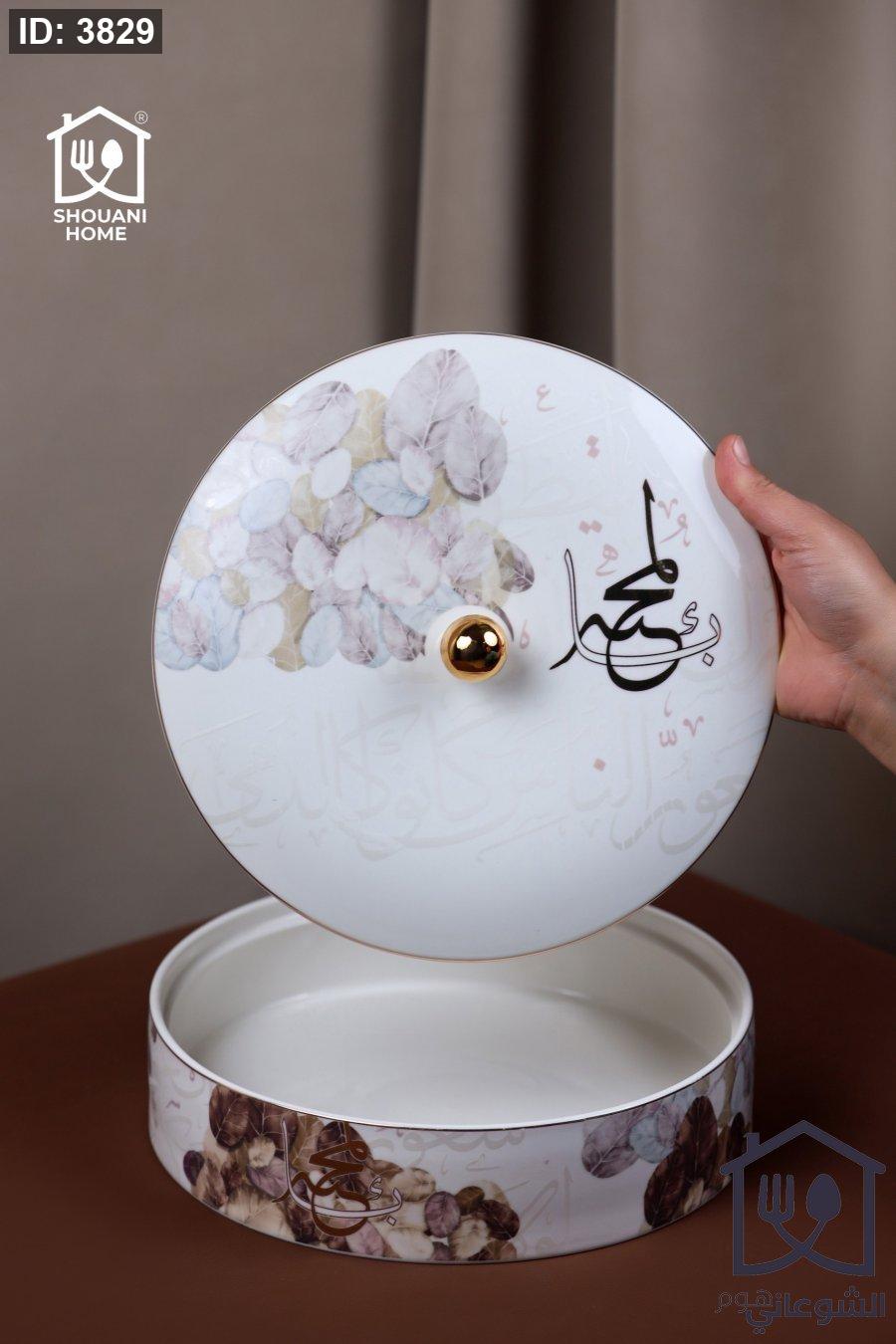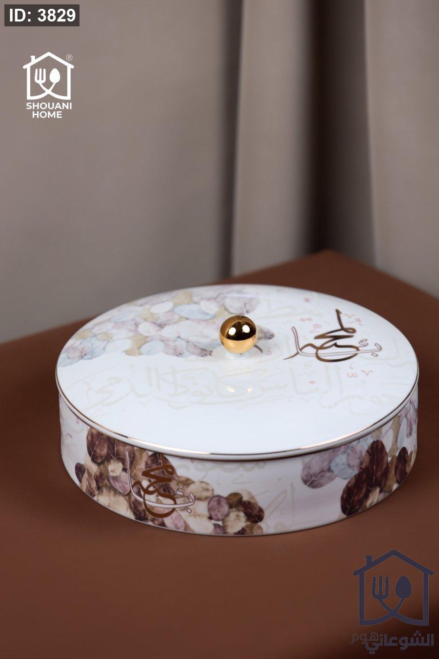 مضيفة بورسلان دائرية اوف وايت مع غطاء حز ذهبي مورد شكل مسجد كتابة (َيْقِظْ شُعُورَ الْمَحَبَّةِ إِنْ غَفَا لَوْلَا شُعُورُ النَّاسِ كَانُوا كَالدُّمَى)