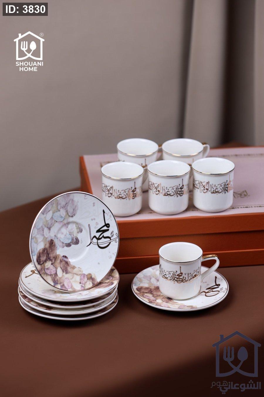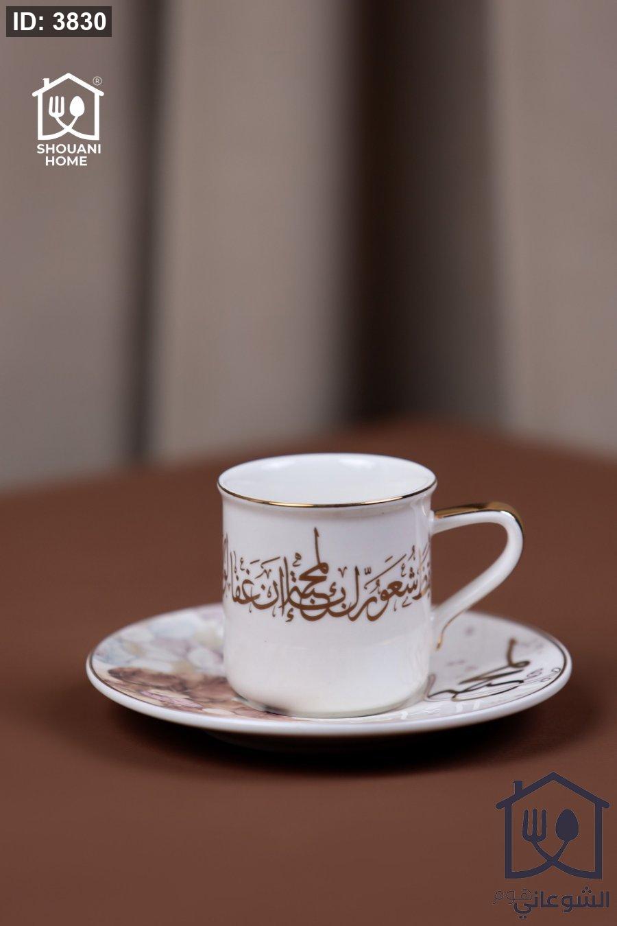 طقم 6 فناجين مع 6 صحون اوف وايت محزز ذهبي مورد شكل مسجد كتابة { أيْقِظْ شُعُورَ الْمَحَبَّةِ إِنْ غَفَا لَوْلَا شُعُورُ النَّاسِ كَانُوا كَالدُّمَى}