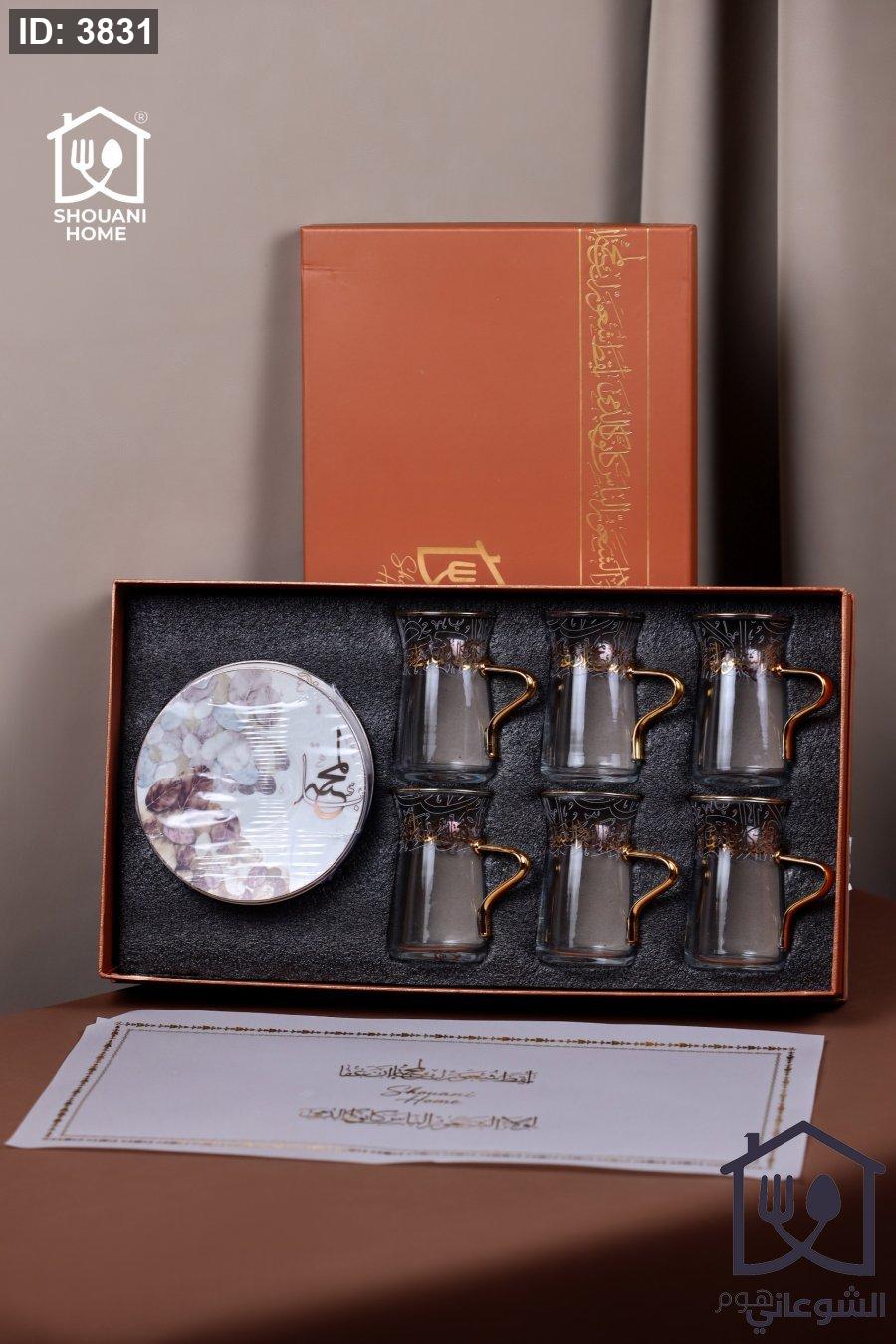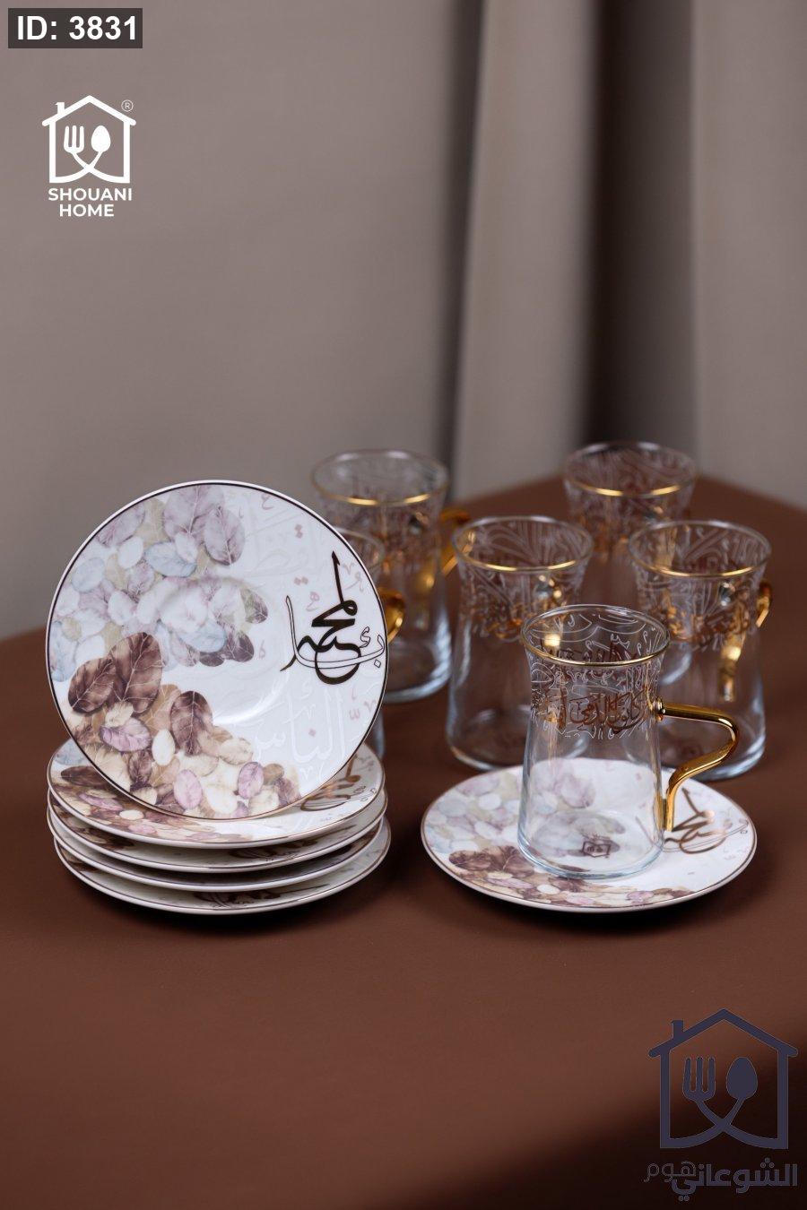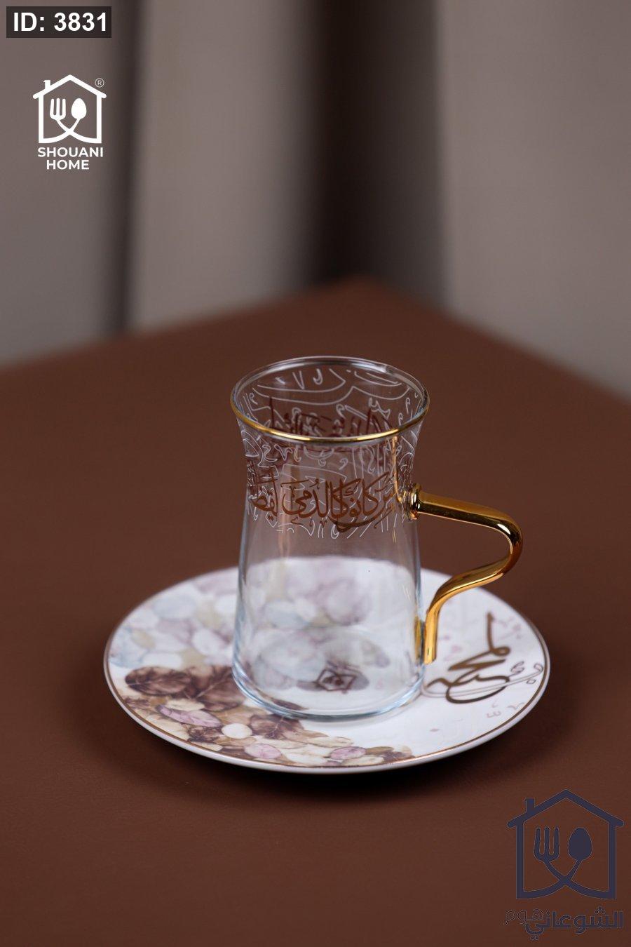 طقم 6 كاسات / استكانات شاي شفاف مع 6 صحون اوف وايت حز ذهبي مورد شكل مسجد كتابة ( بالمحبة )