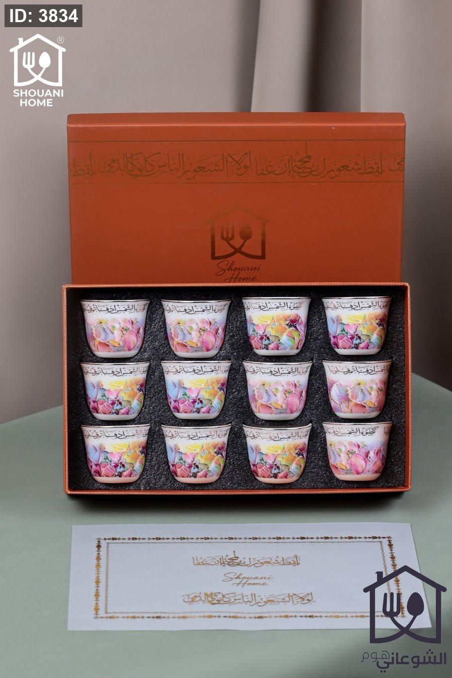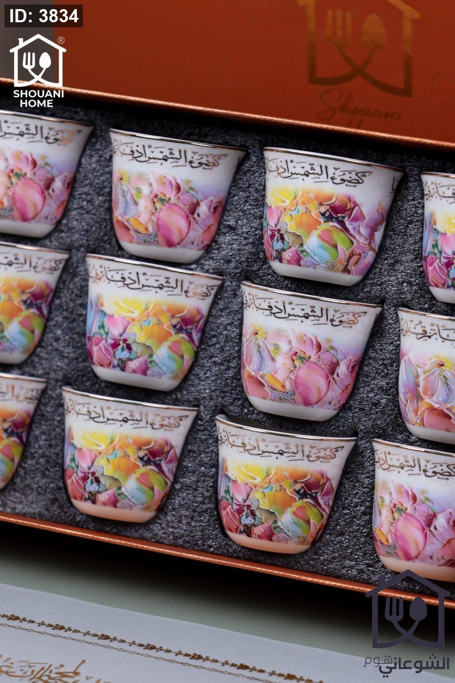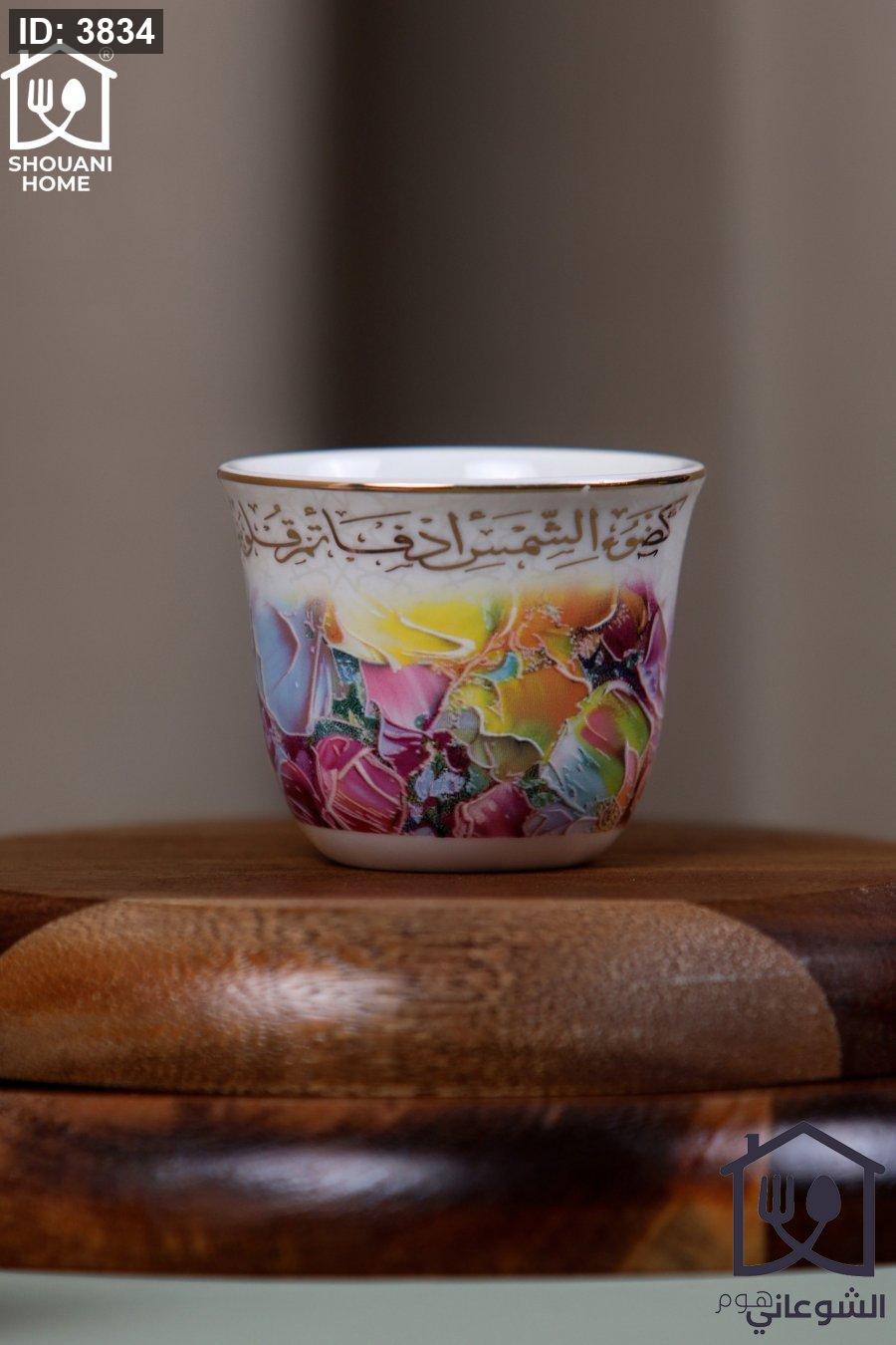 فناجين قهوة سادة اوف وايت موردة زهري اطار ذهبي كتابة { كَضَوْءِ الشَّمْسِ أَدْفَأْتُمْ قُلُوبَنا }