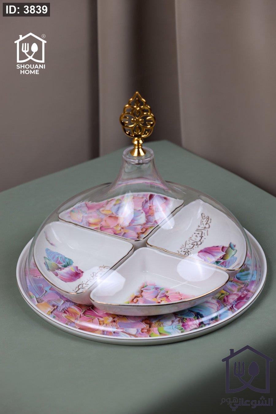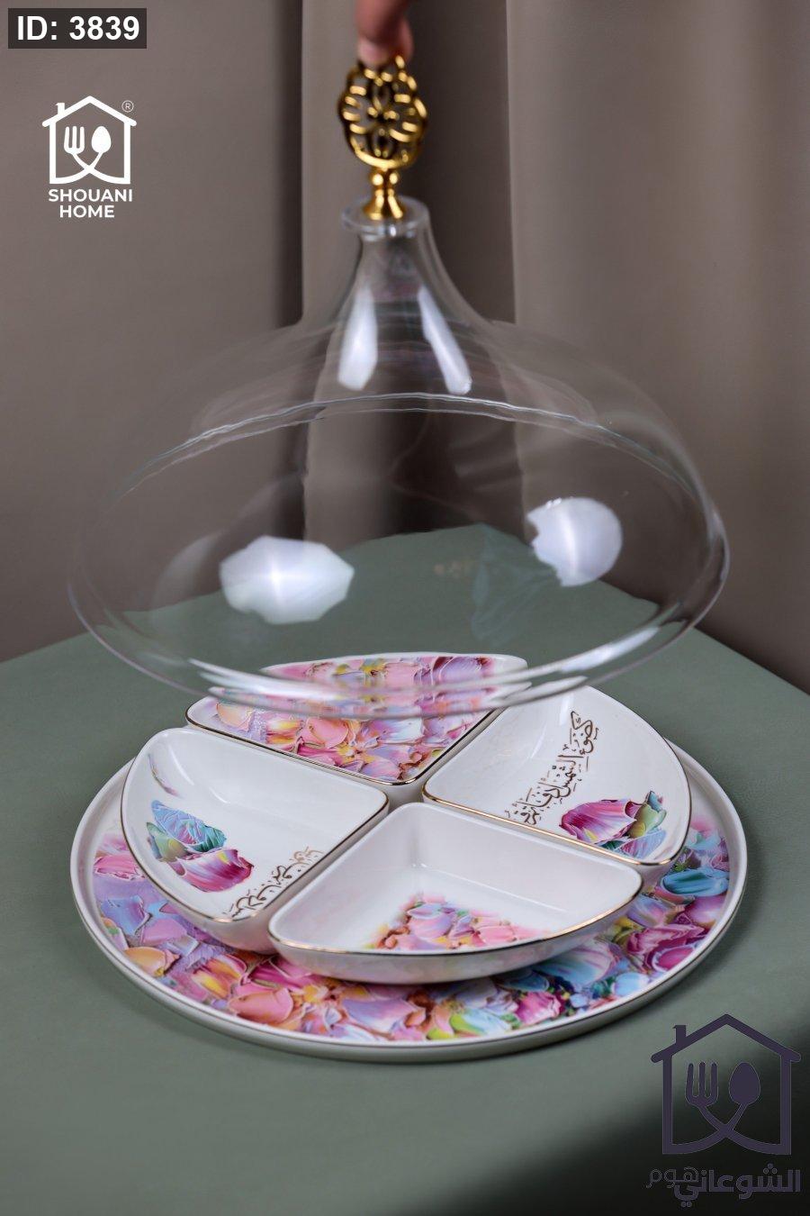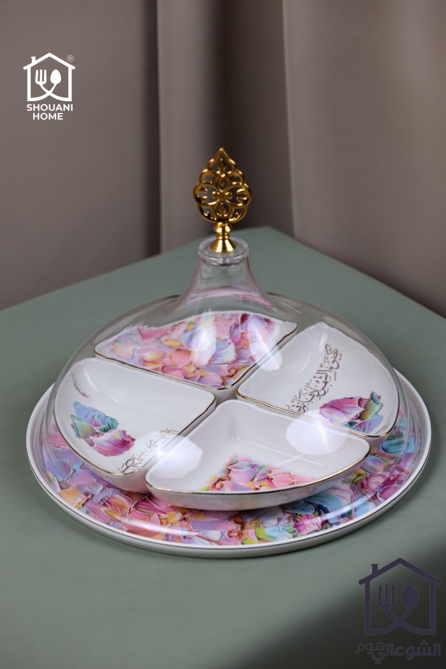مضيفة مع 4 صحون مقسمة اوف وايت موردة زهري اطار ذهبي مع غطاء شفاف كتابة { كَضَوْءِ الشَّمْسِ أَدْفَأْتُمْ قُلُوبَنا }