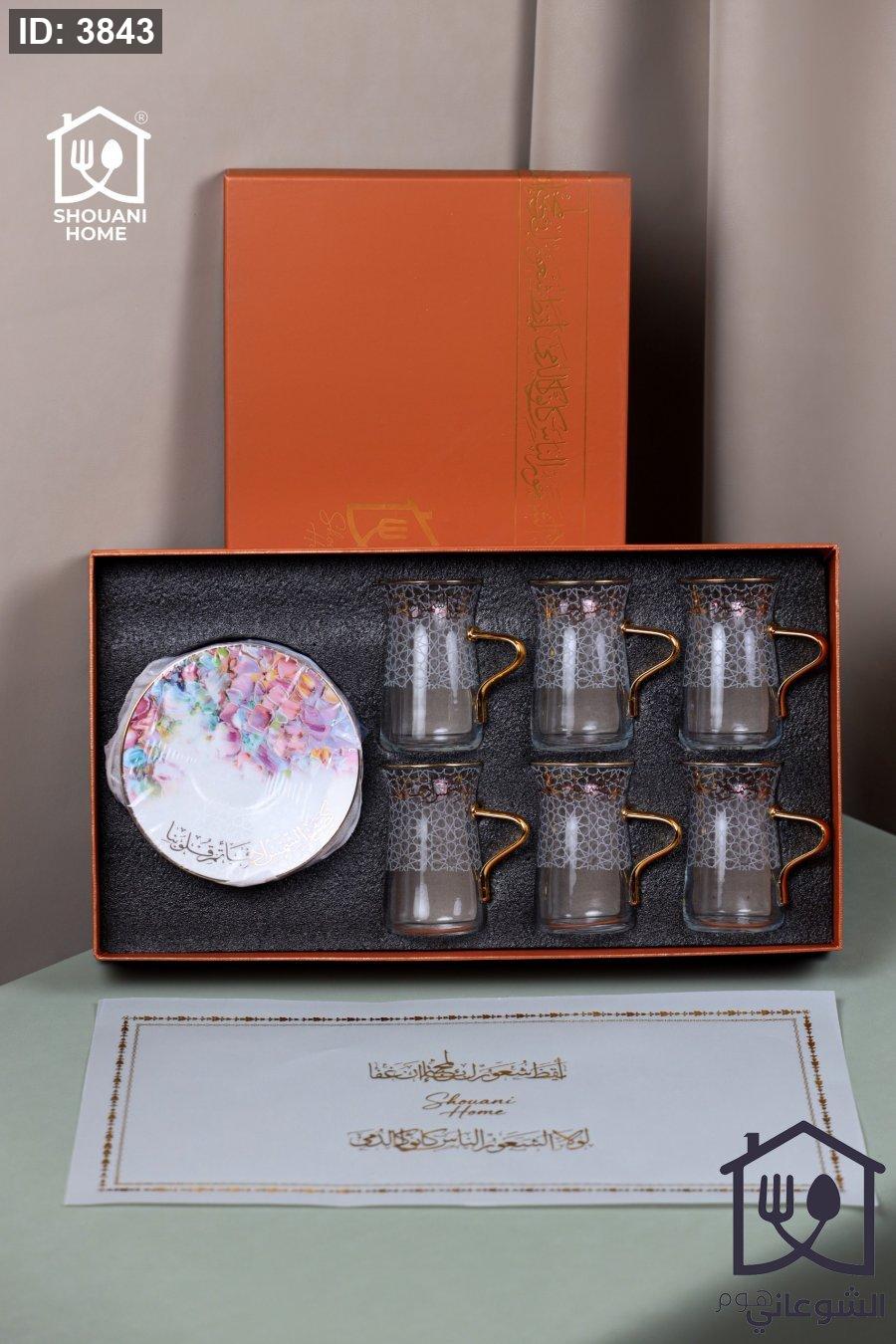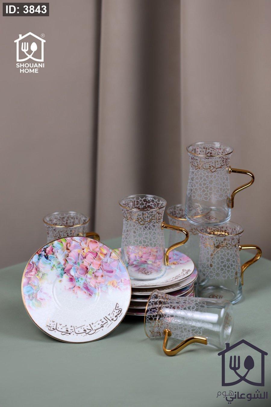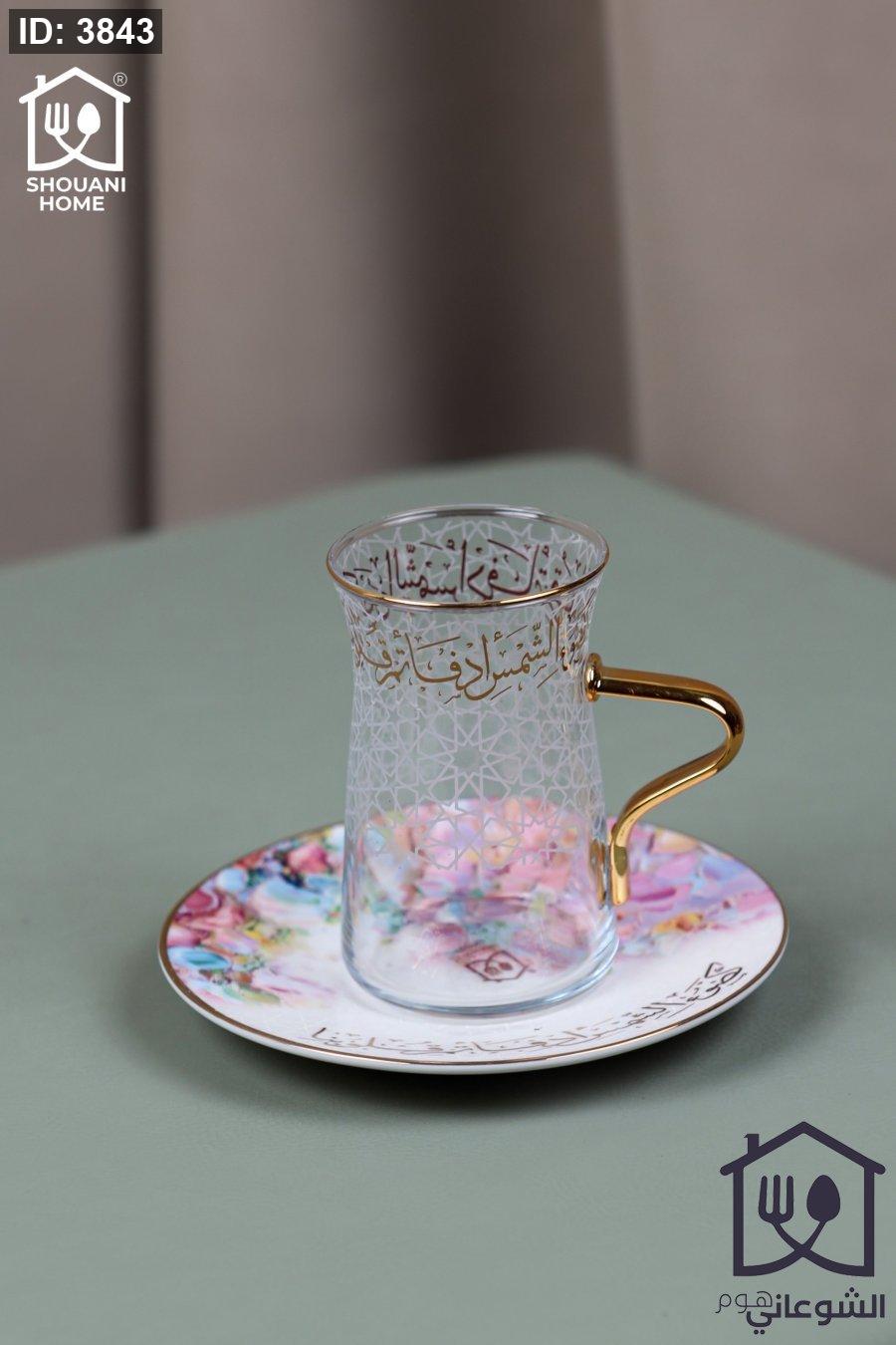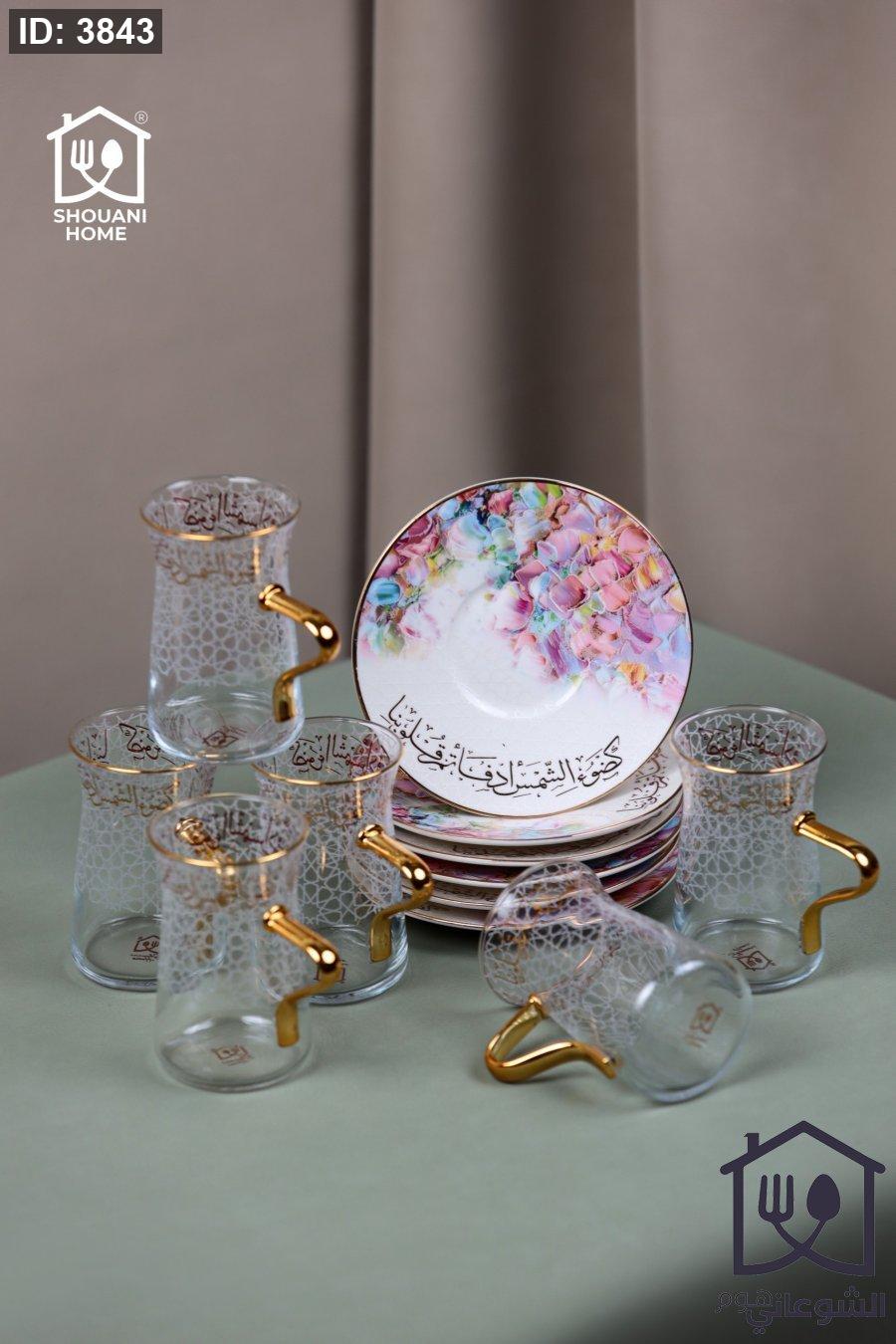 طقم 6 استكانات شاي يد مع 6 صحون اوف وايت موردة زهري اطار ذهبي مع كتابة { كَضَوْءِ الشَّمْسِ أَدْفَأْتُمْ قُلُوبَنا }