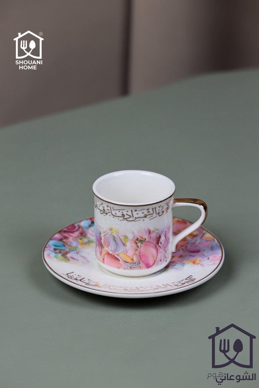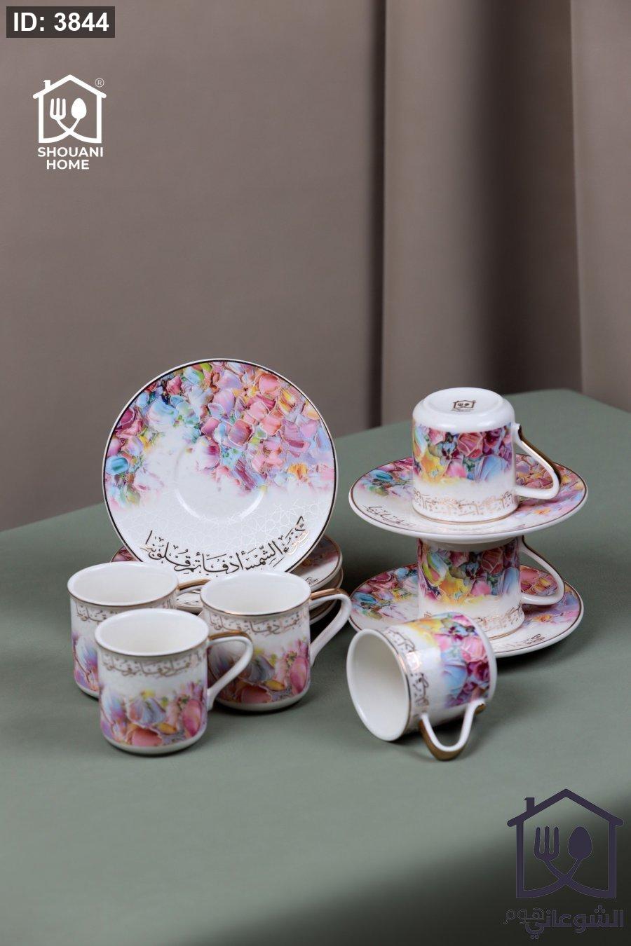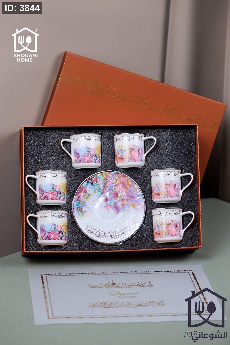 طقم 6 فناجين قهوة يد مع 6 صحون اوف وايت موردة زهري اطار ذهبي مع كتابة { كَضَوْءِ الشَّمْسِ أَدْفَأْتُمْ قُلُوبَنا }
