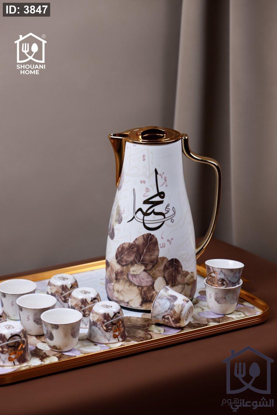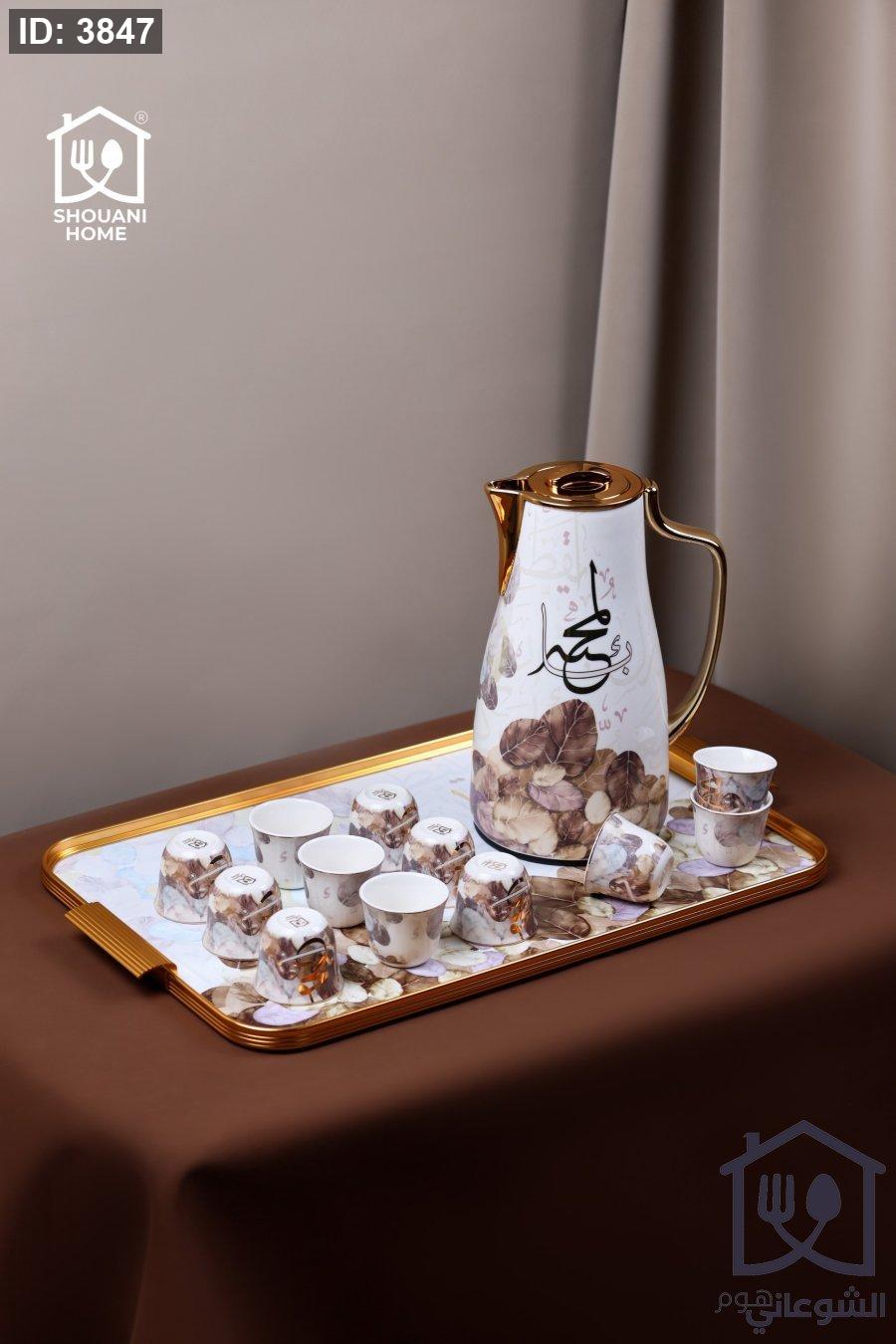 طقم دلة قهوة + 12 فنجان سادة + صينية اوف وايت مع ذهبي مرسم مورد شكل مسجد كتابة ( بالمحبة )