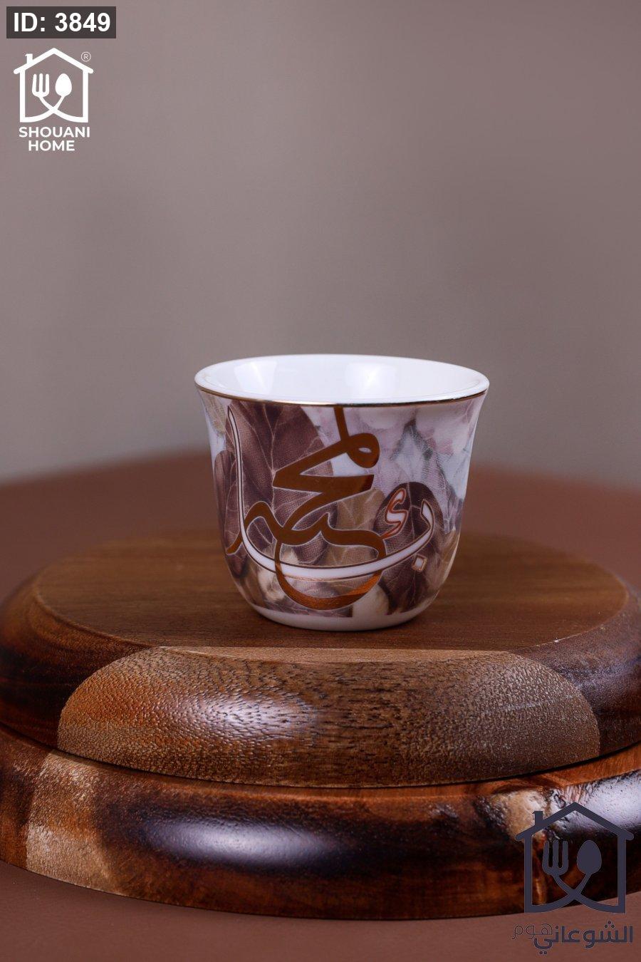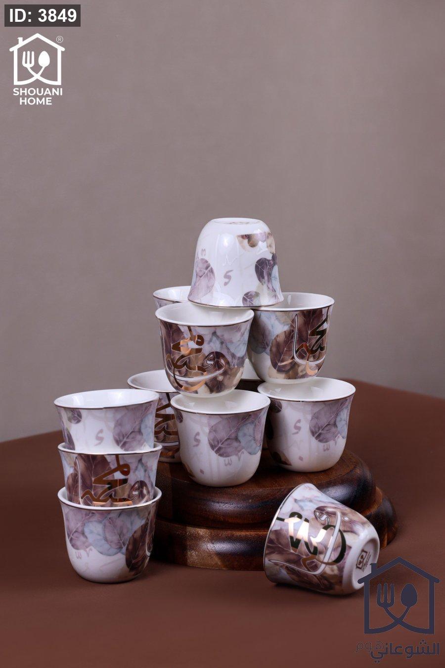 طقم فناجين قهوة سادة 12 قطعة اوف وايت محزز ذهبي مورد شكل مسجد كتابة ( بالمحبة )